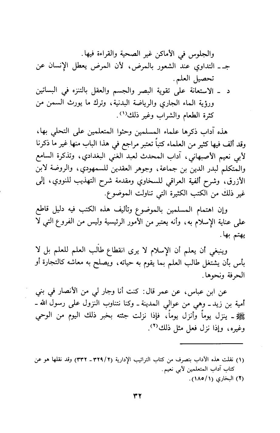 (1) نقلت هذه الآداب بتصرف من كتاب التراتيب الإدارية (2/ 329 - 332) وقد نقلها هو عن كتاب آداب المتعلمين لأبي نعيم.