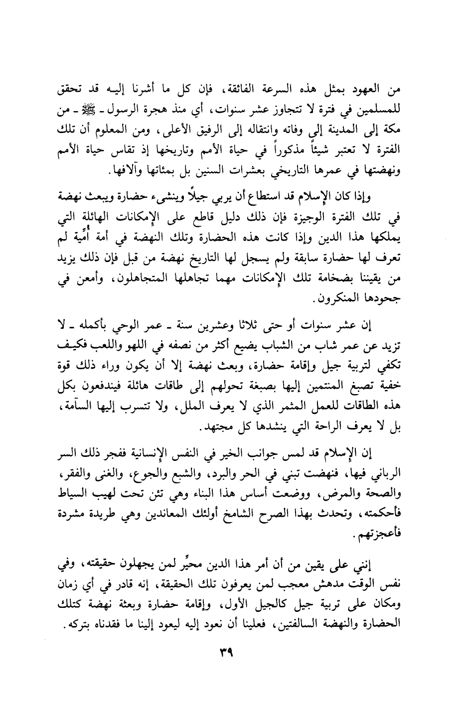 وإذا كان الإسلام قد استطاع أن يربي جيلاً وينشئ حضارة ويبعث نهضة في تلك الفترة الوجيزة فإن ذلك دليل قاطع على الإمكانات الهائلة التي يملكهاغ هذا الدين وإذا كانت هذه الحضارة وتلك النهضة في أمة أميَّة لم تعرف لها حضارة سابقة ولم يسجل لها التاريخ نهضة من قبل فإن ذلك يزيد من يقيننا بضخامة تلك الإمكانات مهما تجاهلها المتجاهلون، وأمعن في جحودها المنكرون.