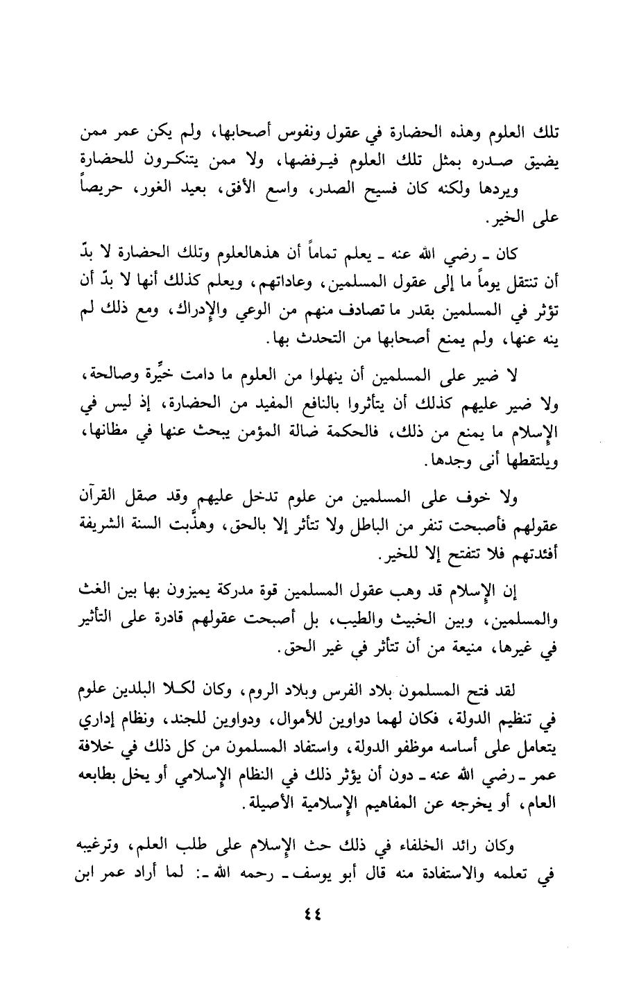 44…تلك العلوم وهذه الحضارة في عقول ونفوس أصحابها، ولم يكن عمر ممن يضيق صدره بمثل تلك العلوم فيرفضها، ولا ممن يتنكرون للحضارة ويردها ولكنه كان فسيح الصدر، واسع الأفق، بعيد الغور، حريصاً على الخير.