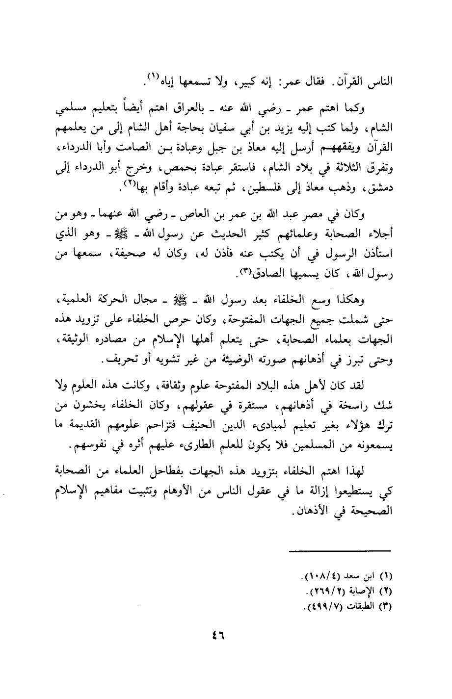 وهكذا وسع الخلفاء بعد رسول الله - صلى الله عليه وسلم - مجال الحركة العلمية، حتى شملت جميع الجهات المفتوحة، وكان حرص الخلفاء على تزويد هذه الجهات بعلماء الصحابة، حتى يتعلم أهلها الإسلام من مصادره الوثيقة، وحتى تبرز في أذهانهم صورته الوضيئة من غير تشويه أو تحريف.