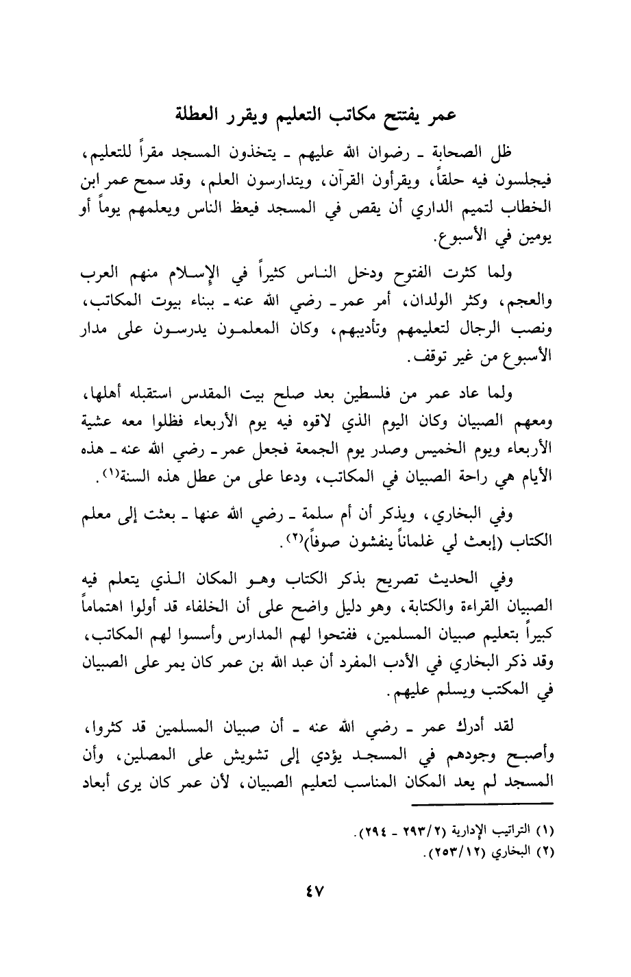 ولما كثرت الفتوح ودخل الناس كثيراً في الإسلام منهم العرب والعجم، وكثر الولدان، أمر عمر - رضي الله عنه - ببناء بيوت المكاتب، ونصب الرجال لتعليمهم وتأديبهم، وكان المعلمون يدرسون على مدار الأسبوع من غير توقف.