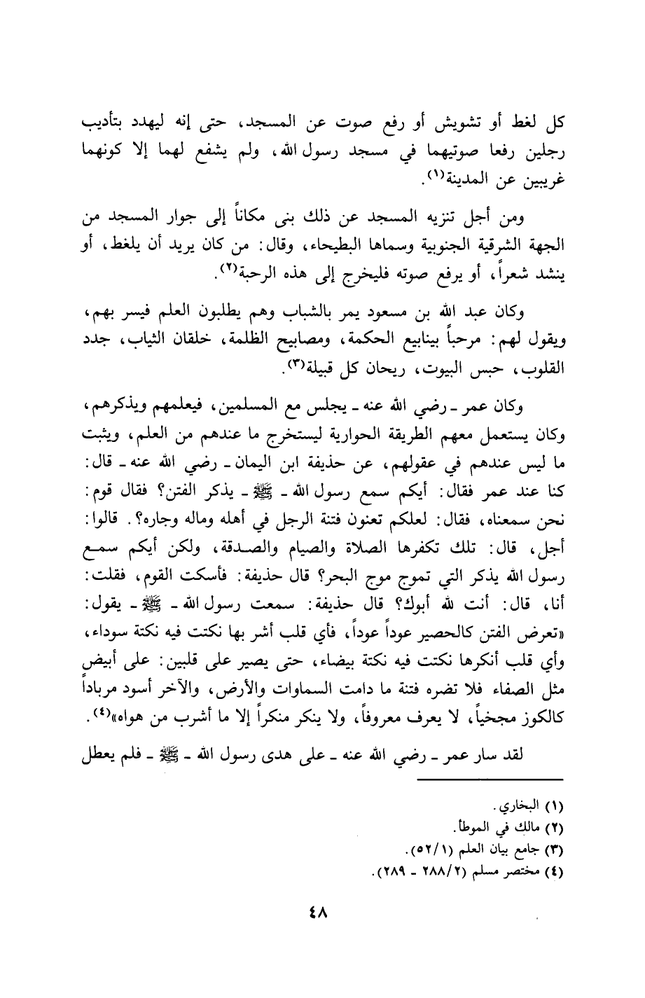 48…كل لغط أو تشويش أو رفع صوت عن المسجد، حتى إنه ليهدد بتأديب رجلين رفعا صوتيهما في مسجد رسول الله، ولم يشفع لهما إلا كونهما غربيين عن المدينة (1).