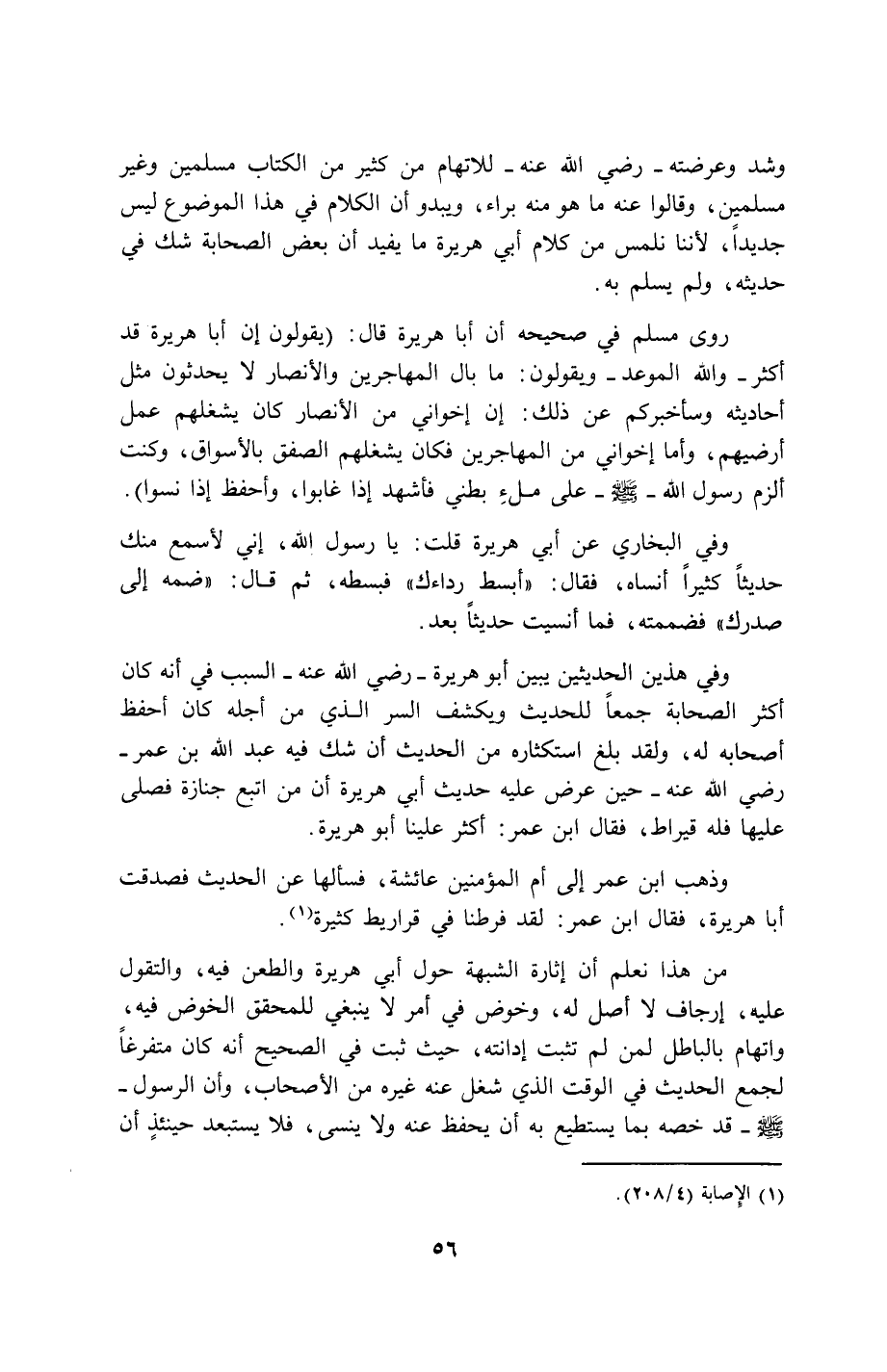 56…وشد عرضته - رضي الله عنه - للاتهام من كثير من الكتاب مسلمين وغير مسلمين، وقالوا عنه ما هو منه براء، ويبدو أن الكلام في هذا الموضوع ليس جديداً، لأننا نلمس من كلام أبي هريرة ما يفيد أن بعض الصحابة شك في حديثه، ولم يسلم به.