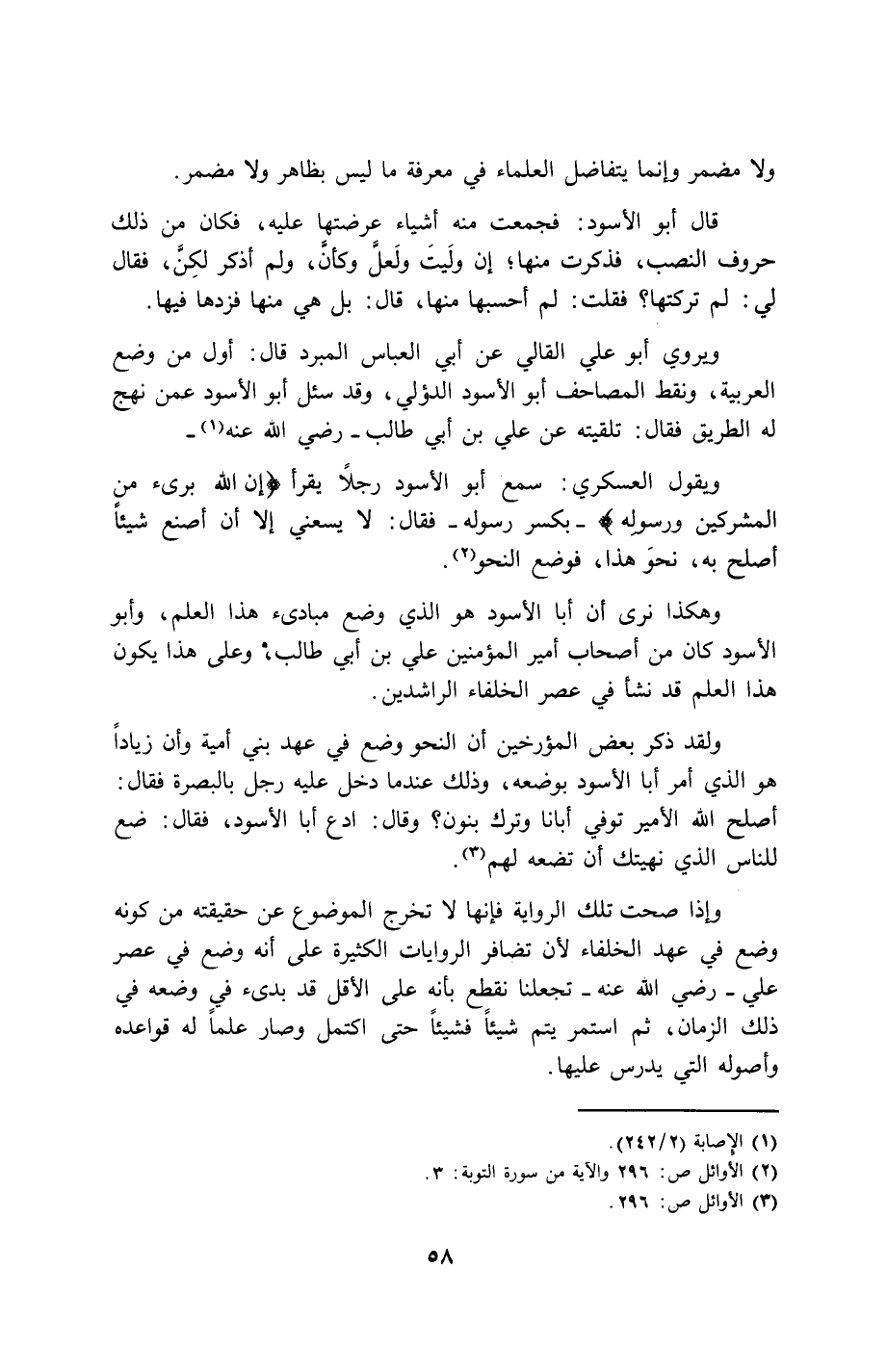 ويروي أبو علي القالي عن أبي العباس المبرد قال: أول من وضع العربية، ونقط المصاحف أبو الأسود الدؤلي، وقد سئل أبو الأسود عمن نهج له الطريق فقال: تلقيته عن علي بن أبي طالب - رضي الله عنه (1) - ويقول العسكري: سمع أبو الأسود رجلاً يقرأ (إن الله برئ من المشركين ورسوله) - بكسر رسوله - فقال: لا يسعني إلا أن اصنع شيئاً أصلح به، نحوَ هذا، فوضع النحو (2).