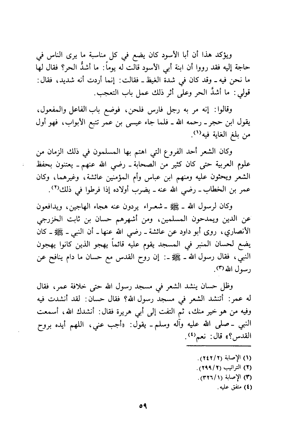 59…ويؤكد هذا أن أبا الأسود كان يضع في كل مناسبة ما يرى الناس في حاجة إليه فقد رووا أن ابنة أبي الأسود قالت له يوماً: ما أشدُّ الحر؟ فقال لها ما نحن فيه - وقد كان في شدة الغيظ - فقالت: إنما أردت أنه شديد، فقال: قولي: ما أشدَّ الحر وعلى أثر ذلك عمل باب التعجب.