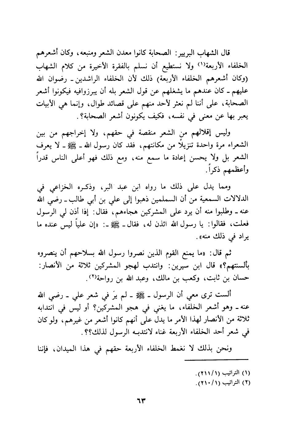 63…قال الشهاب البريير: الصحابة كانوا معدن الشعر ومنبعه، وكان أشعرهم الخلفاء الأربعة (1) ولا نستطيع أن نسلم بالفقرة الأخيرة من كلام الشهاب (وكان أشعرهم الخلفاء الأربعة) ذلك لأن الخلفاء الراشدين -رضوان الله عليهم- كان عندهم ما يشغلهم عن قول الشعر بله أن يبرزوا فيه فيكونوا أشعر الصحابة، على أننا لم نعثر لأحد منهم على قصائد طوال، وإنما هي الأبيات يعبر عنها عن معنى في نفسه، فكيف يكونون أشعر الصحابة؟.