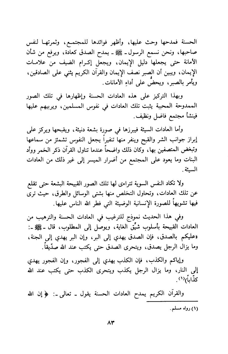 83…الحسنة فمدحها وحث عليها، وأظهر فوائدها للمجتمع، وثمرتها لنفس صاحبها، ونحن نسمع الرسول -صلى الله عليه وسلم- يمدح الصدق كعادة، ويرفع من شأن الأمانة حتى يجعلها دليل الإيمان، ويجعل إكرام الضيف من علامات الإيمان، ويبين أن الصبر نصف الإيمان والقرآن الكريم يثني على الصادقين، ويأمر بالصبر، ويخضُّ على أداء الأمانات.