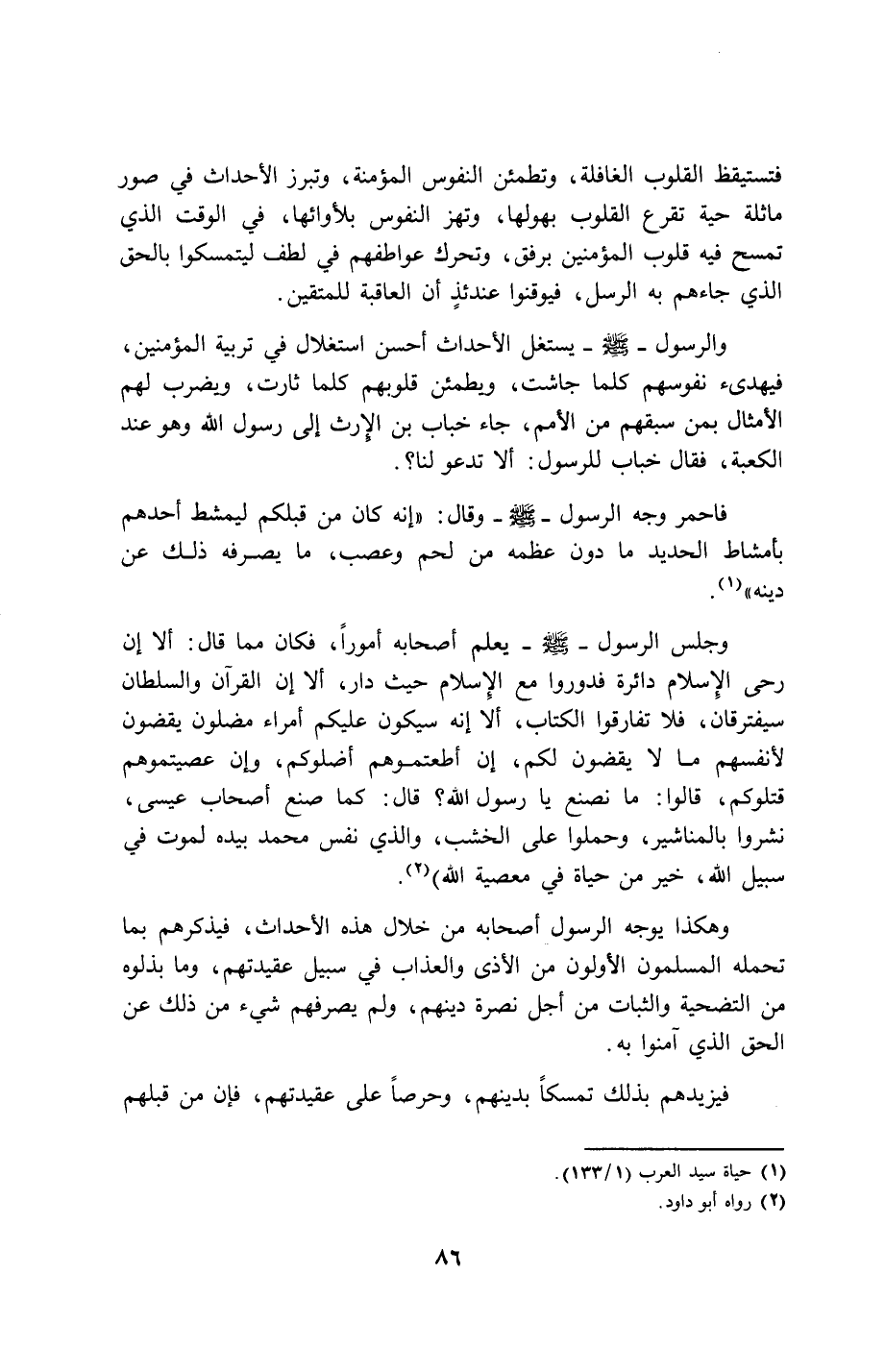 وهكذا يوجه الرسول أصحابه من خلال هذه الأحداث، فيذكرهم بما تحمله المسلمون الأولون من الأذى والعذاب في سبيل عقيدتهم، وما بذلوه من التضحية والثبات من أجل نصرة دينهم، ولم يصرفهم شيء من ذلك عن الحق الذي آمنوا به.