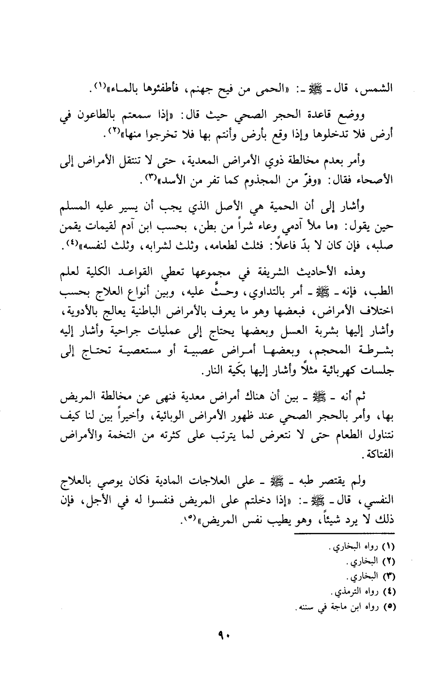 ثم أنه -صلى الله عليه وسلم- بين أن هناك أمراض معدية فنهى عن مخالطة المريض بها، وأمر بالحجر الصحي عند ظهور الأمراض الوبائية، وأخيراً بين لنا كيف نتناول الطعام حتى لا نتعرض لما يترتب على كثرته من التخمة والأمراض الفتاكة.