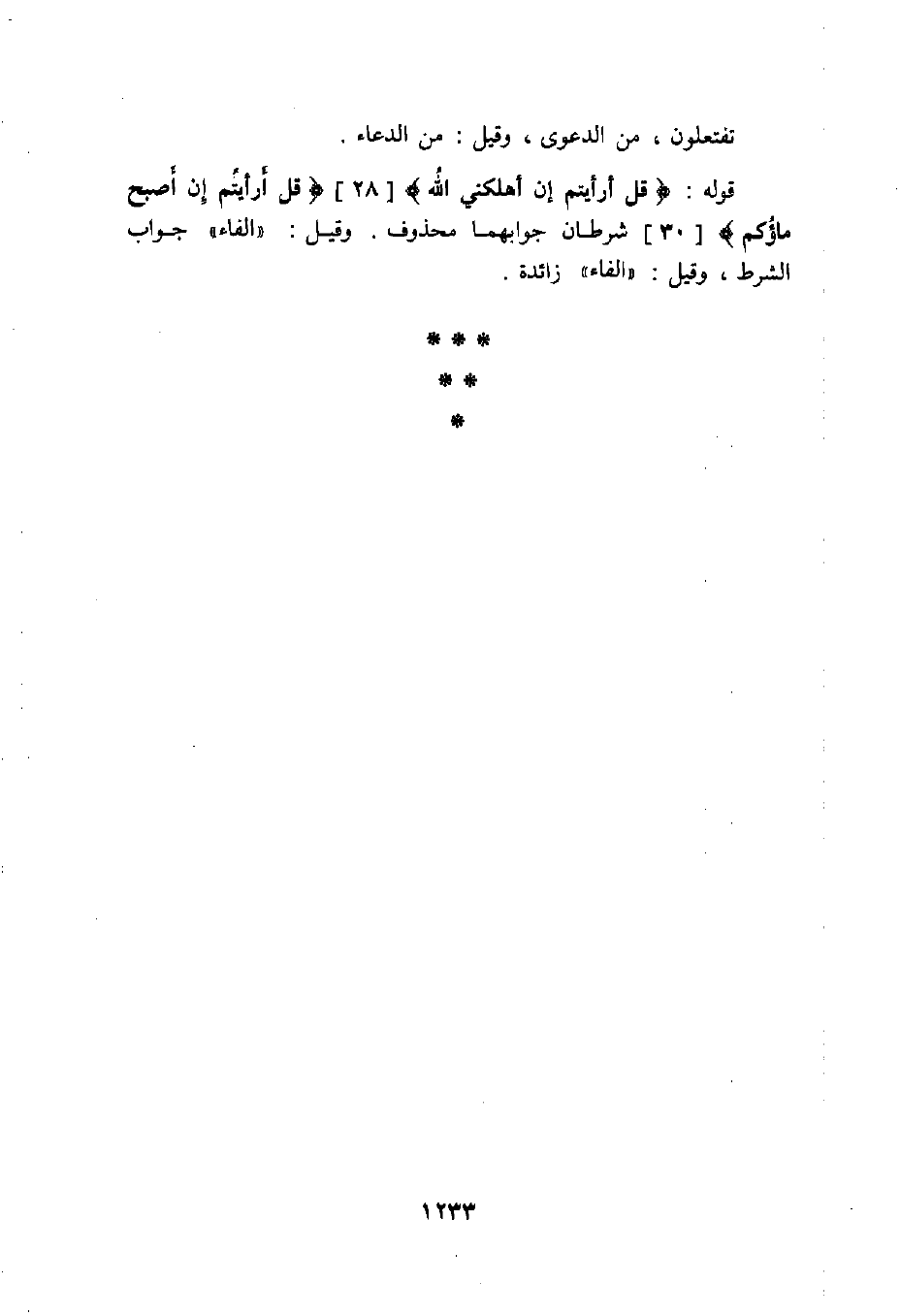 قوله: (قُلْ أَرَأَيْتُمْ إِنْ أَهْلَكَنِيَ اللَّهُ) ، (قُلْ أَرَأَيْتُمْ إِنْ أَصْبَحَ مَاؤُكُمْ غَوْرًا) ، شرطان جوابهما محذوف. وقيل: "الفاء" جواب الشرط، وقيل: " الفاء" زائدة.