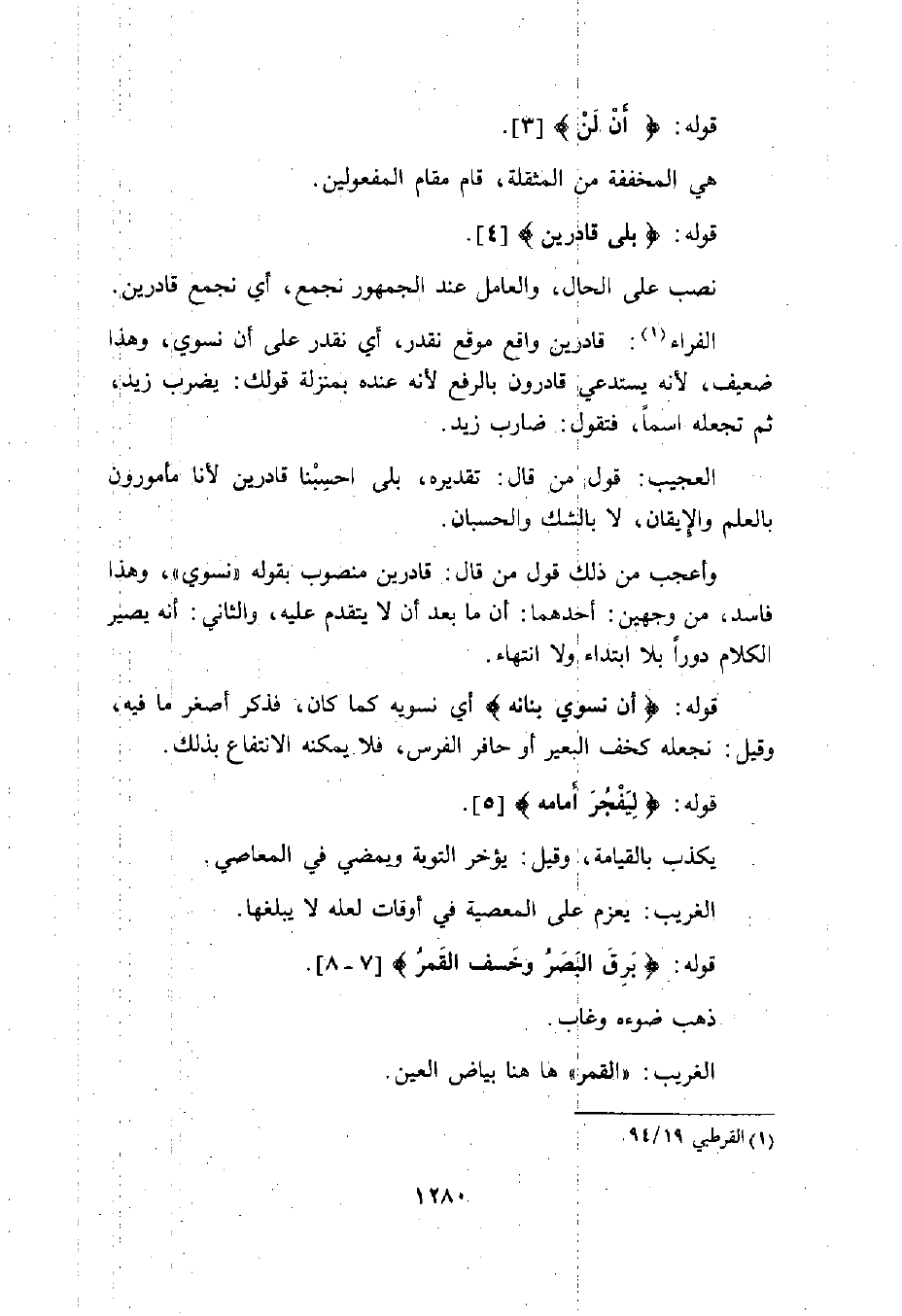 وأعجب من ذلك قول من قال: قَادِرِينَ منصوب بقوله "نُسَوِّيَ"، وهذا
