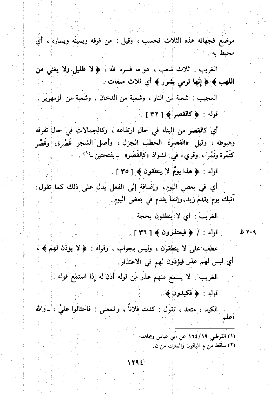 الغريب: (ثَلَاثِ شُعَبٍ) ، هو ما فسره الله، (لَا ظَلِيلٍ وَلَا يُغْنِي مِنَ اللَّهَبِ (31) إِنَّهَا تَرْمِي بِشَرَرٍ) أي ثلاث صفات.