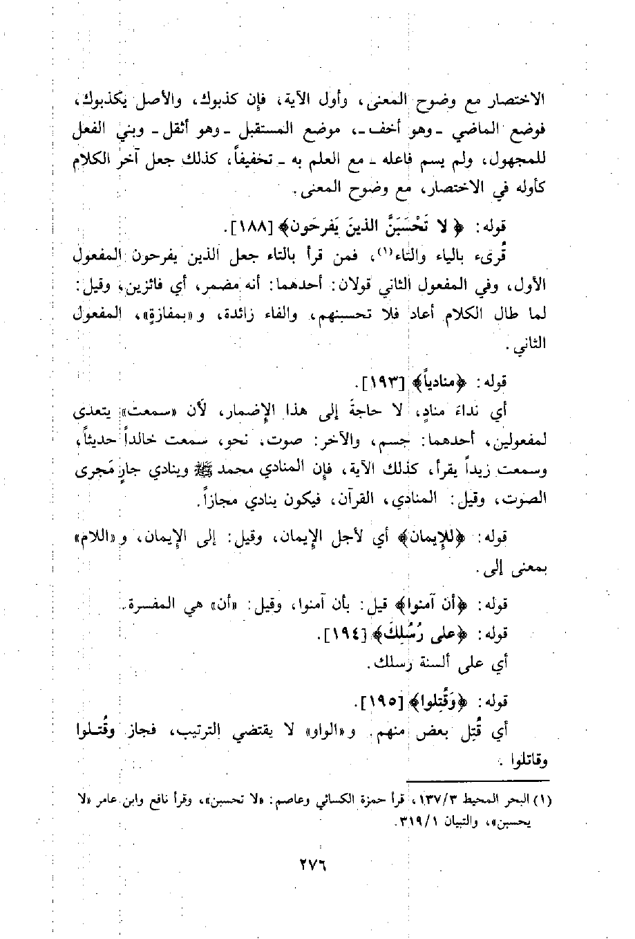 واختلف في (لا يحسبن الذين يفرحون. . . فلا يحسبنهم) الآية 188 فابن كثير وأبو عمر وبالغيب فيهما وفتح الباء في الأولى وضمها في الثاني وافقهم ابن محيصن واليزيدي والفعل الأول مسند إليه أو غيره والذين مفعول أول والثاني بمفازة أي لا يحسبن الرسول الفرحين ناجين والفعل الثاني مسند إلى ضمير الذين ومن ثمة ضمت الباء لتدل على واو الضمير المحذوفة لسكون النون بعدها فمفعوله الأول والثاني محذوف تقديره كذلك أي فلا يحسبن الفرحون أنفسهم ناجية والفاء عاطفة وقرأ عاصم وحمزة والكسائي ويعقوب وخلف بتاء الخطاب فيهما وفتح الباء فيهما معا وافقهم الأعمش إسناد فيها للمخاطب والثاني تأكيد للأول والفاء زائدة أي لا تحسبن الفرحين ناجين لا تحسبنهم كذلك وقرأ نافع وابن عامر وأبو جعفر بياء الغيب في الأول وتاء الخطاب في الثاني وفتح الموحدة فيهما إسناد للأول إلى الذين والثاني إلى المخاطب وافقهم الحسن وفتح السين في الفعلين ابن عامر وعاصم وحمزة وأبو جعفر. اهـ (إتحاف فضلاء البشر. ص: 233: 234) .