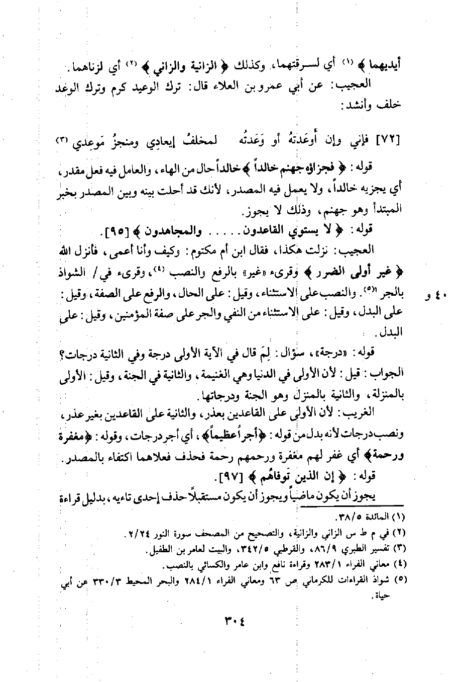 والنصب على الاستثناء، وقيل: على الحال، والرفع على الصفة، وقيل: على البدل، وقيل: على الاستثناء من النفي والجر على صفة المؤمنين، وقيل: على البدل.