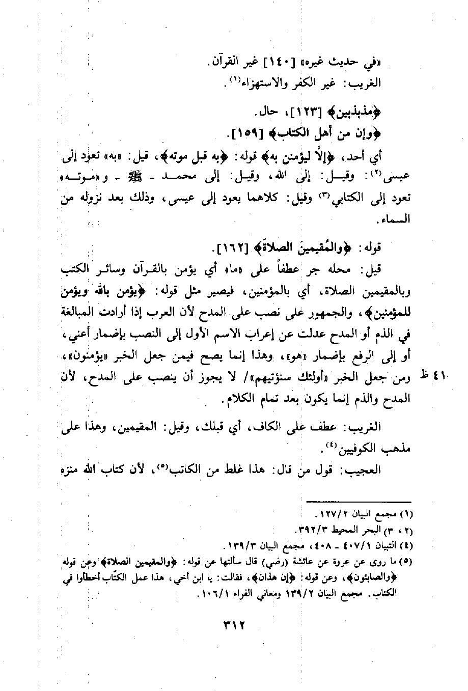 (إِلَّا لَيُؤْمِنَنَّ بِهِ قَبْلَ مَوْتِهِ) قوله " (بِهِ قَبْلَ مَوْتِهِ) ، قيل: "بِهِ" تعود إلى عيسى: وقيل: إلى الله، وقيل: إلى محمد - صلى الله عليه وسلم -