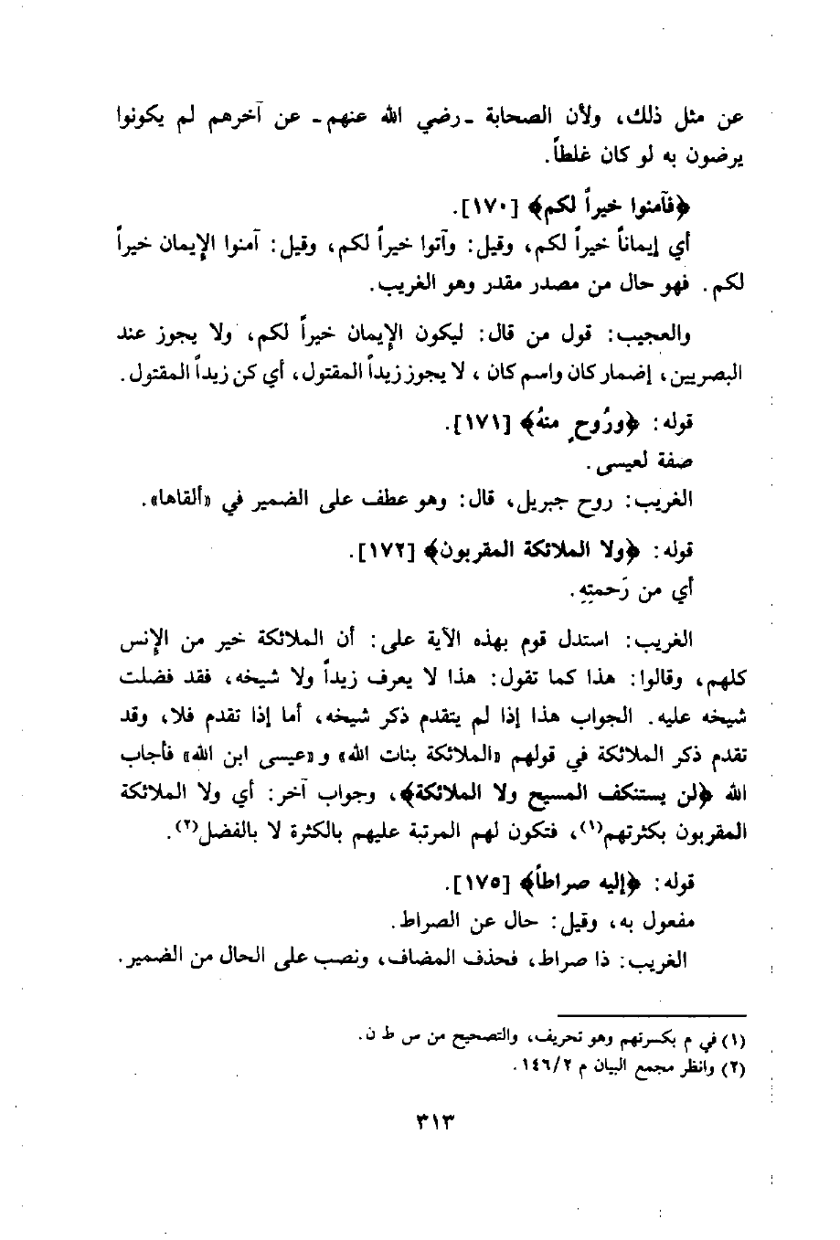 فأجاب الله (لَنْ يَسْتَنْكِفَ الْمَسِيحُ أَنْ يَكُونَ عَبْدًا لِلَّهِ وَلَا الْمَلَائِكَةُ الْمُقَرَّبُونَ) ، وجواب آخر: أي ولا الملائكة المقربون بكثرتهم، فتكون لهم المرتبة عليهم بالكثرة لا بالفضل.