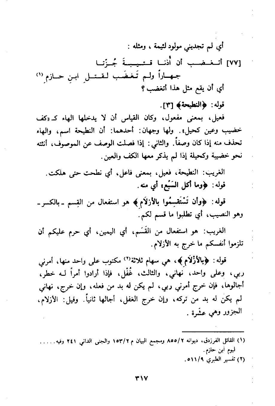 أن النَّطِيحَة اسم، والهاء تحذف منه إذا كان وصفا.