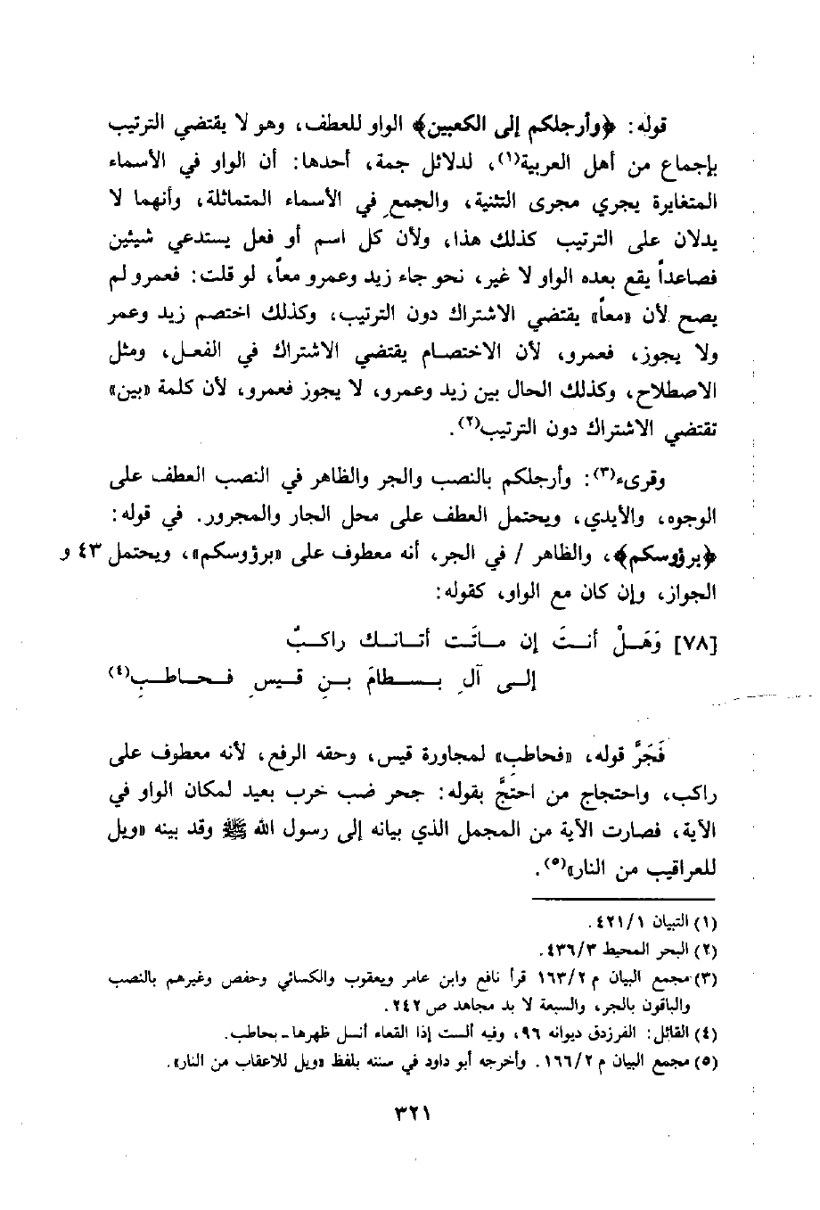 واختلف في (وَأَرْجُلَكُمْ) الآية 6 فنافع وابن عامر وحفص والكسائي ويعقوب بنصب اللام عطفا على أيديكم فإن حكمها الغسل كالوجه وعن الحسن بالرفع على الابتداء والخبر محذوف أي مغسولة وعلى الأول يكون وامسحوا جملة معترضة بين المتعاطفين وهو كثير في القرآن وكلام العرب والباقون بالخفض عطفا على رؤسكم لفظا ومعنى ثم نسخ بوجوب الغسل أو بحمل المسح على بعض الأحوال وهو لبس الخف وللتنبيه على عدم الإسراف في الماء لأنها مظنة لصب الماء كثيرا فعطفت على الممسوح والمراد الغسل أو خفض على الجوار قال القاضي ونظيره كثير لكن قال بعضهم لا ينبغي التخريج على الجوار لأنه لم يرد إلا في النعت أو ما شذ من غيره.