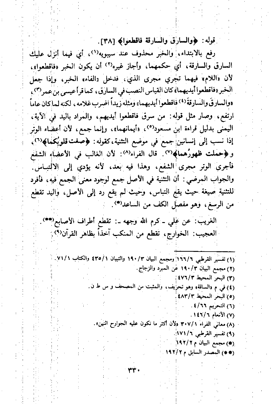 الخبر "فَاقْطَعُوا أَيْدِيَهُمَا" كان القياس النصب في السارق، كما قرأ عيسى بن عمر، "والسارقَ والسارقةَ فاقطعوا أيديهما) ومثله زيداً اضرب كلامه، لكنه لما كان عاماً ارتفع، وصار مثل قوله: من سرق فاقطعوا أيديهم، والمراد باليد في الآية، اليمنى بدليل قراءة ابن مسعود، "أيمانهما"، وإنما جمع، لأن أعضاء الوتر إذا نسب إلى إنسانين جمع في موضع التثنية، كقوله: (صَغَتْ قُلُوبُكُمَا) ، و (حَمَلَتْ ظُهُورُهُمَا) .