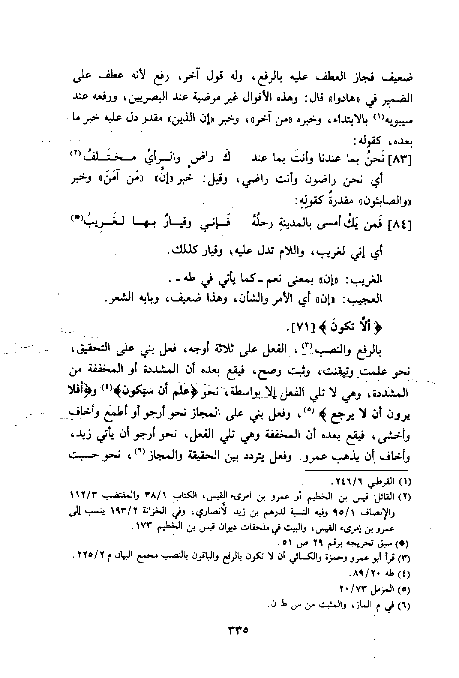 واختلف في (أَلَّا تَكُونَ) الآية 71 فأبو عمرو وحمزة والكسائي ويعقوب وخلف برفع النون على أن أن مخففة من الثقيلة واسمها ضمير الشأن محذوف أي أنه ولا نافية وتكون تامة وفتنة فاعلها والجملة خبر أن وهي مفسرة لضمير الشأن وحسب حينئذ للتيقن لا للشك لأن أن المخففة لا تقع إلا بعد تيقن وافقه اليزيدي والأعمش والباقون بالنصب على أن الناصبة للمضارع دخلت على فعل منفى بلا ولا لا تمنع أن يعمل ما قبلها فيما بعدها من ناصب وجازم وجار وحسب حينئذ على بابها من الظن لأن الناصبة لا تقع بعد علم والمخففة لا تقع بعد غيره. اهـ (إتحاف فضلاء البشر. ص: 255: 256) .