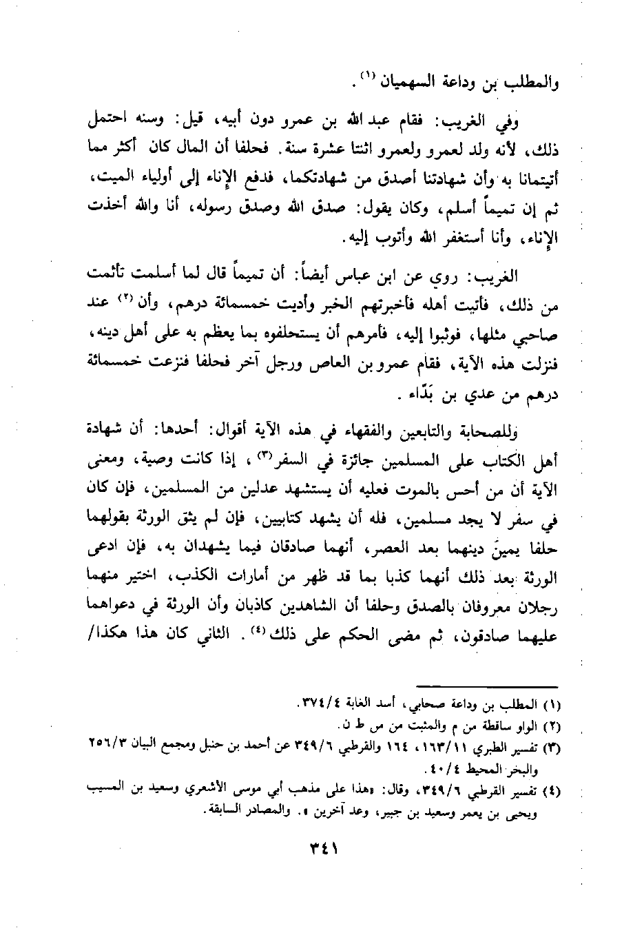 صاحبي مثلها، فوثبوا إليه، فأمرهم أن يستحلفوه بما يعظم به على أهل دينه، فنزلت هذه الآية، فقام عمرو بن العاص ورجل آخر فحلفا فنزعت خمسمائة درهم من عدي بن بَدَّاء.