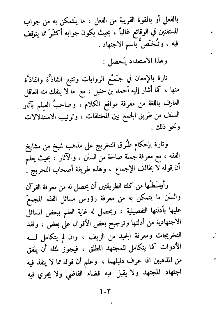 وأوسطها من كلتا الطريقتين أَن يحصل لَهُ من معرفَة الْقُرْآن وَالسّنَن مَا يتَمَكَّن بِهِ من عَرَفَة رُؤُوس مسَائِل الْفِقْه الْمجمع عَلَيْهَا بأدلتها التفصيلية وَيحصل لَهُ غَايَة الْعلم بِبَعْض الْمسَائِل الاجتهادية من أدلتها وترجيح بعض الْأَقْوَال على بعض وَنقد التخريجات وَمَعْرِفَة الْجيد من الزيف وان لم يتكامل لَهُ الأدوات كَمَا يتكامل للمجتهد الْمُطلق فَيجوز لمثله أَن يلفق من المذهبين اذا عرف دليلهما وَعلم أَن قَوْله مِمَّا لَا ينفذ فِيهِ اجْتِهَاد الْمُجْتَهد وَلَا يقبل فِيهِ قَضَاء القَاضِي وَلَا يجْرِي فِيهِ