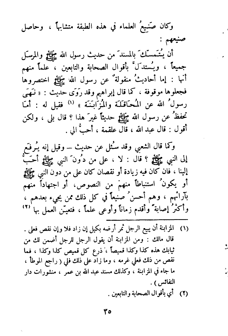 أَن يتَمَسَّك بالمسند من حَدِيث رَسُول الله صلى الله عَلَيْهِ وَسلم والمرسل جَمِيعًا ويستدل بأقوال الصَّحَابَة وَالتَّابِعِينَ علما مِنْهُم أَنَّهَا إِمَّا أَحَادِيث منقولة عَن رَسُول الله صلى الله عَلَيْهِ وَسلم اختصروها فجعلوها مَوْقُوفَة كَمَا قَالَ إِبْرَاهِيم وَقد روى حَدِيث نهى رَسُول الله عَن المحاقلة والمزابنة فَقيل لَهُ أما تحفظ عَن رَسُول الله صلى الله عَلَيْهِ وَسلم حَدِيثا غير هَذَا قَالَ بلَى وَلَكِن أَقُول قَالَ عبد الله قَالَ عَلْقَمَة أحب إِلَيّ