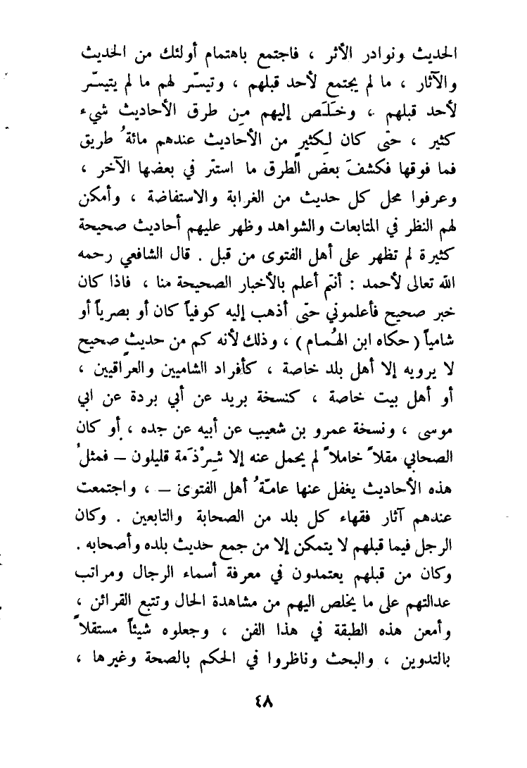 الحَدِيث ونوادر الْأَثر فَاجْتمع باهتمام أُولَئِكَ من الحَدِيث والْآثَار مَا لم يجْتَمع لأحد قبلهم وتيسر لَهُم مَا لم يَتَيَسَّر لأحد قبلهم وخلص إِلَيْهِم من طرق الْأَحَادِيث شَيْء كثير حَتَّى كَانَ لكثير من الْأَحَادِيث عِنْدهم مائَة طَرِيق فَمَا فَوْقهَا فكشف بعض الطّرق مَا استتر فِي بَعْضهَا الآخر وَعرفُوا مَحل كل حَدِيث من الغرابة والاستفاضة وَأمكن لَهُم النّظر فِي المتابعات والشواهد وَظهر عَلَيْهِم أَحَادِيث صَحِيحَة كَثِيرَة لم تظهر على أهل الْفَتْوَى من قبل قَالَ الشَّافِعِي رَحمَه الله تَعَالَى لِأَحْمَد أَنْتُم أعلم بالأخبار الصَّحِيحَة منا فاذا كَانَ خبر صَحِيح فأعلموني حَتَّى أذهب إِلَيْهِ كوفيا كَانَ أَو بصريا أَو شاميا حَكَاهُ ابْن الْهمام وَذَلِكَ لِأَنَّهُ كم من حَدِيث صَحِيح لَا يرويهِ إِلَّا أهل بلد خَاصَّة كأفراد الشاميين والعراقيين أَو أهل بَيت خَاصَّة كنسخة بريد عَن أبي بردة عَن أبي مُوسَى ونسخة عَمْرو بن شُعَيْب عَن أَبِيه عَن جده أَو كَانَ الصَّحَابِيّ مقلا خاملا لم يحمل عَنهُ إِلَّا شرذمة قَلِيلُونَ فَمثل هَذِه الْأَحَادِيث يغْفل عَنْهَا عَامَّة أهل الْفَتْوَى وَاجْتمعت عِنْدهم آثَار فُقَهَاء كل بلد من الصَّحَابَة وَالتَّابِعِينَ وَكَانَ الرجل فِيمَا قبلهم لَا يتَمَكَّن إِلَّا من جمع حَدِيث بَلَده وَأَصْحَابه وَكَانَ من قبلهم يعتمدون فِي معرفَة أَسمَاء الرِّجَال ومراتب عدالتهم على مَا يخلص إِلَيْهِم من مُشَاهدَة الْحَال وتتبع الْقَرَائِن وأمعن هَذِه الطَّبَقَة فِي هَذَا الْفَنّ وجعلوه شَيْئا مُسْتقِلّا بالتدوين والبحث وناظروا فِي الحكم بِالصِّحَّةِ وَغَيرهَا