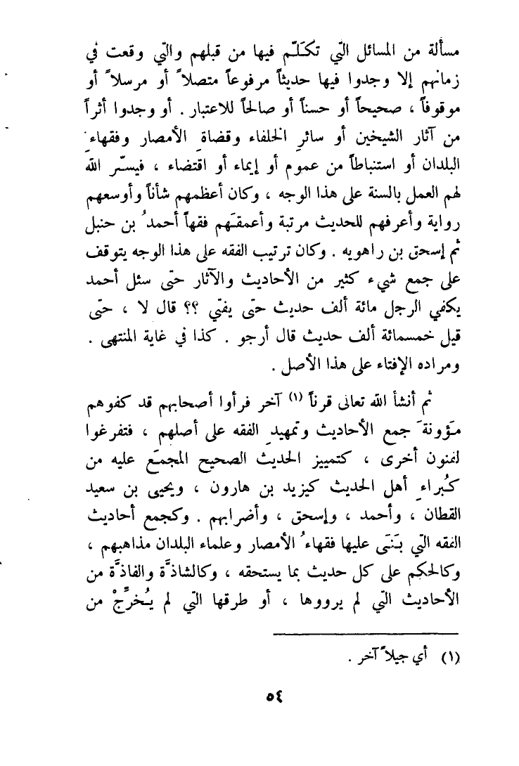 مسأله من الْمسَائِل الَّتِي تكلم فِيهَا من قبلهم وَالَّتِي وَقعت فِي زمانهم إِلَّا وجدوا فِيهَا حَدِيثا مَرْفُوعا مُتَّصِلا أَو مُرْسلا أَو مَوْقُوفا صَحِيحا أَو حسنا أَو صَالحا للاعتبار أَو وجدوا أثرا من آثَار الشَّيْخَيْنِ أَو سَائِر الْخُلَفَاء وقضاة الْأَمْصَار وفقهاء الْبلدَانِ أَو استنباطا من عُمُوم أَو إِيمَاء أَو اقْتِضَاء فيسر الله لَهُم الْعَمَل بِالسنةِ على هَذَا الْوَجْه وَكَانَ أعظمهم شَأْنًا وأوسعهم رِوَايَة وأعرفهم للْحَدِيث مرتبَة وأعمقهم فقها أَحْمد بن حَنْبَل ثمَّ إِسْحَاق بن رَاهَوَيْه وَكَانَ تَرْتِيب الْفِقْه على هَذَا الْوَجْه يتَوَقَّف على جمع شَيْء كثير من الْأَحَادِيث والْآثَار حَتَّى سُئِلَ أَحْمد يَكْفِي الرجل مائَة ألف حَدِيث حَتَّى يُفْتِي قَالَ لَا حَتَّى قيل خَمْسمِائَة ألف حَدِيث قَالَ أَرْجُو كَذَا فِي غَايَة الْمُنْتَهى وَمرَاده الْإِفْتَاء على هَذَا الأَصْل