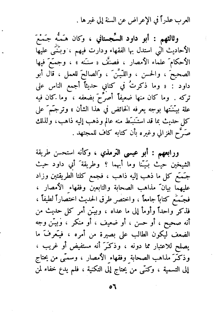 وثالثهم أَبُو دَاوُد السجسْتانِي وَكَانَ همه جمع الْأَحَادِيث الَّتِي اسْتدلَّ بهَا الْفُقَهَاء ودارت فيهم وَبنى عَلَيْهَا الْأَحْكَام عُلَمَاء الْأَمْصَار فصنف سنَنه وَجمع فِيهَا الصَّحِيح وَالْحسن واللين والصالح للْعَمَل قَالَ أَبُو دَاوُد وَمَا ذكرت فِي كتابي حَدِيثا أجمع النَّاس على تَركه وَمَا كَانَ مِنْهَا ضَعِيفا أصرح بضعفه وَمَا كَانَ فِيهِ عِلّة بينتها بِوَجْه يعرفهُ الخائض فِي هَذَا الشَّأْن وَترْجم على كل حَدِيث بِمَا قد استنبط مِنْهُ عَالم وَذهب إِلَيْهِ ذَاهِب وَلذَلِك صرح الْغَزالِيّ وَغَيره بِأَن كِتَابه كَاف للمجتهد
