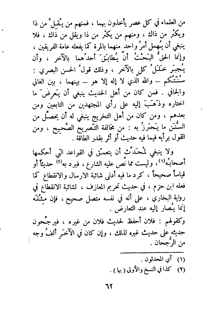 من الْعلمَاء فِي كل عصر يَأْخُذُونَ بهما فَمنهمْ من يقل من ذَا وَيكثر من ذَلِك وَمِنْهُم من يكثر من ذَا ويقل من ذَاك فَلَا يَنْبَغِي أَن يهمل أَمر وَاحِد مِنْهُمَا بالمرة كَمَا يَفْعَله عَامَّة الْفَرِيقَيْنِ وَإِنَّمَا الْحق البحت أَن يُطَابق أَحدهمَا بِالْآخرِ وَأَن يجْبر خلل كل بِالْآخرِ وَذَلِكَ قَول الْحسن الْبَصْرِيّ سنتكم وَالله الَّذِي لَا إِلَه إِلَّا هُوَ بَينهمَا بَين الغالي والجافي فَمن كَانَ من أهل الحَدِيث يَنْبَغِي أَن يعرض مَا اخْتَارَهُ وَذهب إِلَيْهِ على رَأْي الْمُجْتَهدين من التَّابِعين وَمن بعدهمْ وَمن كَانَ من أهل التَّخْرِيج يَنْبَغِي لَهُ أَن يحصل من السّنَن مَا يحْتَرز بِهِ من مُخَالفَة التَّصْرِيح الصَّحِيح وَمن القَوْل بِرَأْيهِ فِيمَا فِيهِ حَدِيث أَو أثر بِقدر الطَّاقَة