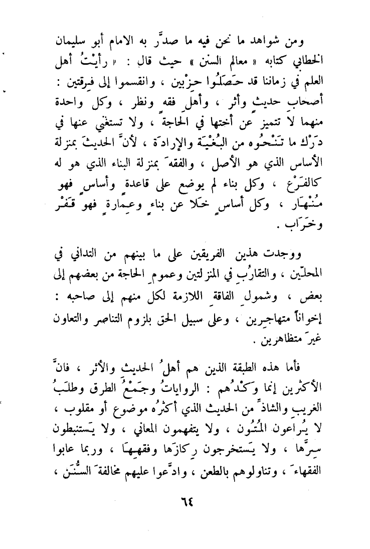 وَمن شَوَاهِد مَا نَحن فِيهِ مَا صدر بِهِ الامام أَبُو سُلَيْمَان الْخطابِيّ كِتَابه معالم السّنَن حَيْثُ قَالَ رَأَيْت أهل الْعلم فِي زَمَاننَا قد حصلوا حزبين وانقسموا إِلَى فرْقَتَيْن أَصْحَاب حَدِيث وَأثر وَأهل فقه وَنظر وكل وَاحِدَة مِنْهُمَا لَا تتَمَيَّز عَن أُخْتهَا فِي الْحَاجة وَلَا تَسْتَغْنِي عَنْهَا فِي دَرك مَا تنحوه من البغية والإرادة لِأَن الحَدِيث بِمَنْزِلَة الأساس الَّذِي هُوَ الأَصْل وَالْفِقْه بِمَنْزِلَة الْبناء الَّذِي هُوَ لَهُ كالفرع وكل بِنَاء لم يوضع على قَاعِدَة وأساس فَهُوَ منهار وكل أساس خلا عَن بِنَاء وَعمارَة فَهُوَ قفر وخراب