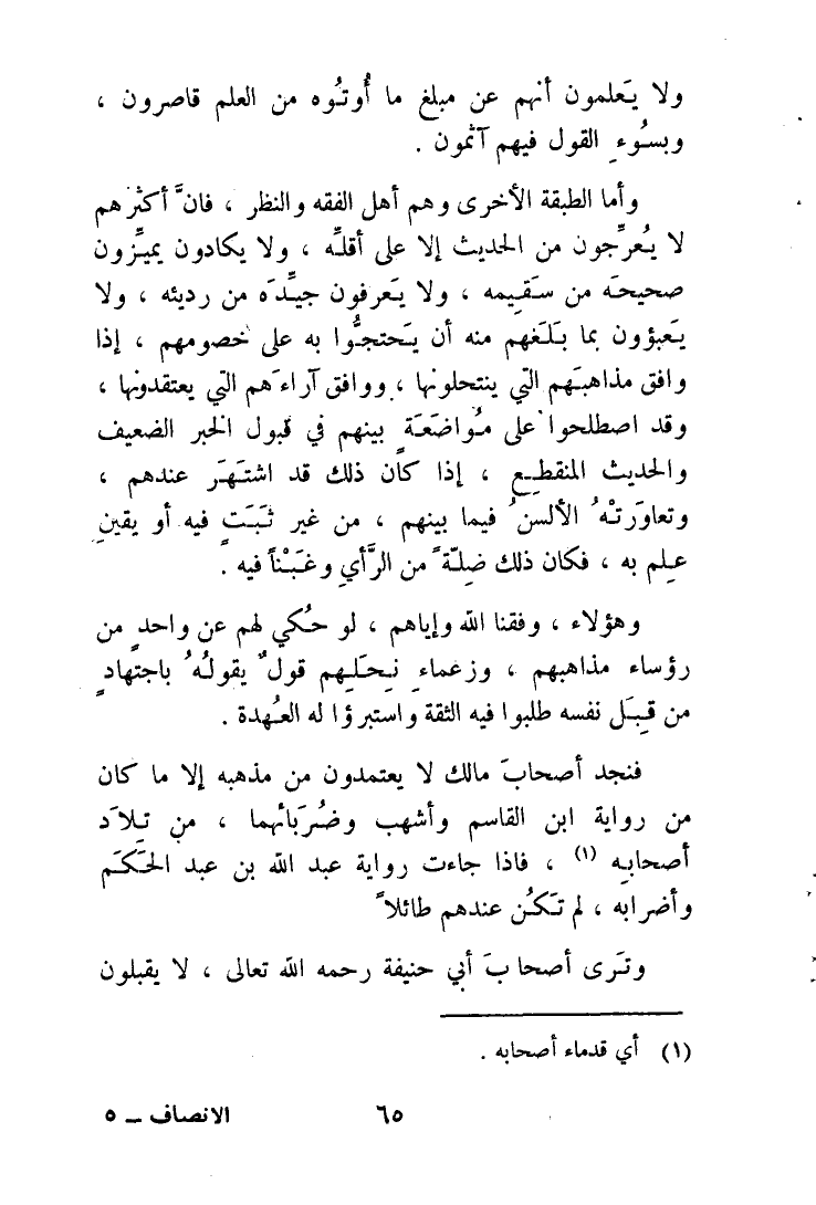 وَأما الطَّبَقَة الْأُخْرَى وهم أهل الْفِقْه وَالنَّظَر فان أَكْثَرهم لَا يعرجون من الحَدِيث إِلَّا على أَقَله وَلَا يكادون يميزون صَحِيحه من سقيمه وَلَا يعْرفُونَ جيده من رديئه وَلَا يعبؤون بِمَا بَلغهُمْ مِنْهُ أَن يحتجوا بِهِ على خصومهم إِذا وَافق مذاهبهم الَّتِي ينتحلونها وَوَافَقَ آراءهم الَّتِي يعتقدونها وَقد اصْطَلحُوا على مواضعة بَينهم فِي قبُول الْخَبَر الضَّعِيف والْحَدِيث الْمُنْقَطع إِذا كَانَ ذَلِك قد اشْتهر عِنْدهم وتعاورته الألسن فِيمَا بَينهم من غير ثَبت فِيهِ أَو يَقِين علم بِهِ فَكَانَ ذَلِك صلَة من الرَّأْي وغبنا فِيهِ