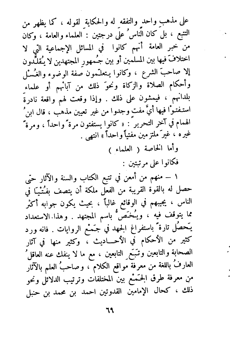 1 - مِنْهُم من أمعن فِي تتبع الْكتاب وَالسّنة والْآثَار حَتَّى حصل لَهُ بِالْقُوَّةِ الْقَرِيبَة من الْفِعْل ملكة أَن يَتَّصِف بِفُتْيَا فِي النَّاس يُجِيبهُمْ فِي الوقائع غَالِبا بِحَيْثُ يكون جَوَابه أَكثر مِمَّا يتَوَقَّف فِيهِ ويخص باسم الْمُجْتَهد وَهَذَا الاستعداد يحصل تَارَة باستفراغ الْجهد فِي جمع الرِّوَايَات فانه ورد كثير من الْأَحْكَام فِي الْأَحَادِيث وَكثير مِنْهَا فِي آثَار الصَّحَابَة وَالتَّابِعِينَ وَتبع التَّابِعين مَعَ مَالا يَنْفَكّ عَنهُ الْعَاقِل الْعَارِف باللغة من معرفَة مواقع الْكَلَام وَصَاحب الْعلم بالآثار من معرفَة طرق الْجمع بَين المختلفات وترتيب الدَّلَائِل وَنَحْو ذَلِك كَحال القدوتين أَحْمد بن مُحَمَّد بن حَنْبَل