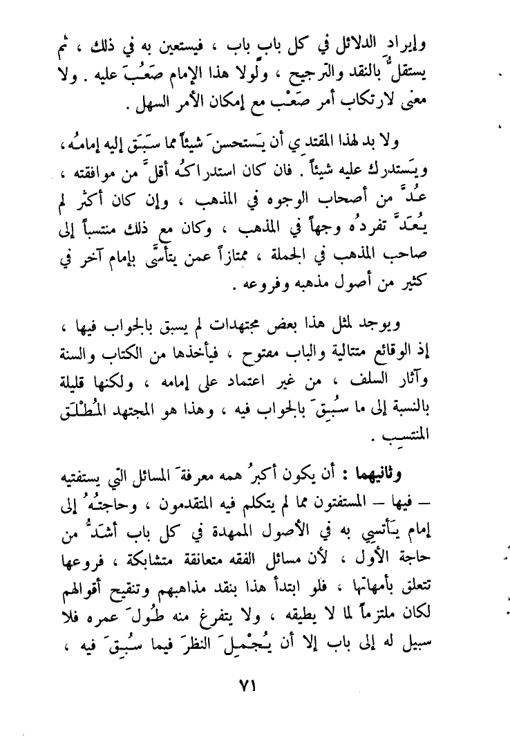 وَثَانِيهمَا أَن يكون أكبر همه معرفَة الْمسَائِل الَّتِي يستفتيه فِيهَا المستفتون مِمَّا لم يتَكَلَّم فِيهِ المتقدمون وَحَاجته إِلَى إِمَام يأتسي بِهِ فِي الْأُصُول الممهدة فِي كل بَاب أَشد من حَاجَة الأول لِأَن مسَائِل الْفِقْه متعانقة متشابكة فروعها تتَعَلَّق بأمهاتها فَلَو ابْتَدَأَ هَذَا بِنَقْد مذاهبهم وتنقيح أَقْوَالهم لَكَانَ مُلْتَزما لما لَا يطيقه وَلَا يتَفَرَّع مِنْهُ طول عمره فَلَا سَبِيل لَهُ إِلَى بَاب إِلَّا أَن يجمل النّظر فِيمَا سبق فِيهِ