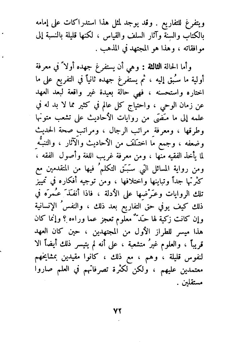 وَأما الْحَالة الثَّالِثَة وَهِي أَن يستفرغ جهده أَولا فِي معرفَة أولية مَا سبق إِلَيْهِ ثمَّ يستفرغ جهده ثَانِيًا فِي التَّفْرِيع على مَا اخْتَارَهُ وَاسْتَحْسنهُ فَهِيَ حَالَة بعيدَة غير وَاقعَة لبعد الْعَهْد عَن زمَان الْوَحْي واحتياج كل عَالم فِي كثير مِمَّا لَا بُد لَهُ فِي علمه إِلَى مَا مضى من رِوَايَات الْأَحَادِيث على تشعب متونها وطرقها وَمَعْرِفَة مَرَاتِب الرِّجَال ومراتب صِحَة الحَدِيث وَضَعفه وَجمع مَا اخْتلف من الْأَحَادِيث والْآثَار والتنبه لما يَأْخُذ الْفَقِيه مِنْهَا وَمن معرفَة غَرِيب اللُّغَة وأصول الْفِقْه وَمن رِوَايَة الْمسَائِل الَّتِي سبق التَّكَلُّم فِيهَا من الْمُتَقَدِّمين مَعَ كثرتها جدا وتباينها واختلافها وَمن تَوْجِيه أفكاره فِي تَمْيِيز تِلْكَ الرِّوَايَات وعرضها على الْأَدِلَّة فاذا أنفذ عمره فِي ذَلِك كَيفَ يُوفي حق التفاريع بعد ذَلِك وَالنَّفس الإنسانية وَإِن كَانَت زكية لَهَا حد مَعْلُوم تعجز عَمَّا وَرَاءه وَإِنَّمَا كَانَ هَذَا ميسر للطراز الأول من الْمُجْتَهدين حِين كَانَ الْعَهْد قَرِيبا والعلوم غير متشعبة على أَنه لم يَتَيَسَّر ذَلِك أَيْضا إِلَّا لنفوس قَليلَة وهم مَعَ ذَلِك كَانُوا مقيدين بمشايخهم معتمدين عَلَيْهِم وَلَكِن لِكَثْرَة تصرفاتهم فِي الْعلم صَارُوا مستقلين