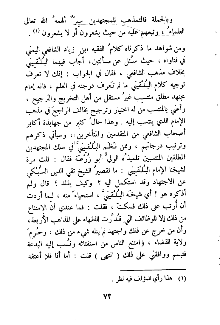 وَمن شَوَاهِد مَا ذَكرْنَاهُ كَلَام الْفَقِيه ابْن زِيَاد الشَّافِعِي اليمني فِي فَتَاوَاهُ حَيْثُ سُئِلَ عَن مَسْأَلَتَيْنِ أجَاب فيهمَا البُلْقِينِيّ بِخِلَاف مَذْهَب الشَّافِعِي فَقَالَ فِي الْجَواب إِنَّك لَا تعرف تَوْجِيه كَلَام البُلْقِينِيّ مَا لم تعرف دَرَجَته فِي الْعلم فانه إِمَام مُجْتَهد مُطلق منتسب غير مُسْتَقل من أهل التَّخْرِيج وَالتَّرْجِيح وأعني بالمنتسب من لَهُ اخْتِيَار وترجيح يُخَالف الرَّاجِح فِي مَذْهَب الإِمَام الَّذِي ينتسب إِلَيْهِ وَهَذَا حَال كثير من جهابذة أكَابِر أَصْحَاب الشَّافِعِي من الْمُتَقَدِّمين والمتأخرين وَسَيَأْتِي ذكرهم وترتيب درجاتهم وَمِمَّنْ نظم البُلْقِينِيّ فِي سلك الْمُجْتَهدين المطلقين المنتسبين تِلْمِيذه الْوَلِيّ أَبُو زرْعَة فَقَالَ قلت مرّة لشَيْخِنَا الإِمَام البُلْقِينِيّ مَا تَقْصِير الشَّيْخ تَقِيّ الدّين السُّبْكِيّ عَن الِاجْتِهَاد وَقد اسْتكْمل إِلَيْهِ وَكَيف يُقَلّد قَالَ وَلم أذكرهُ هُوَ أَي شَيْخه البُلْقِينِيّ استحياء مِنْهُ لما أردْت أَن أرتب على ذَلِك فَسكت فَقلت فَمَا عِنْدِي أَن الِامْتِنَاع من ذَلِك إِلَّا للوظائف الَّتِي قدرت للفقهاء على الْمذَاهب الْأَرْبَعَة وَأَن من خرج عَن ذَلِك واجتهد لم ينله شَيْء من ذَلِك وَحرم ولَايَة الْقَضَاء وَامْتنع النَّاس من استفتائه وَنسب إِلَيْهِ الْبِدْعَة فَتَبَسَّمَ ووافقني على ذَلِك انْتهى قلت أما أَنا فَلَا أعتقد