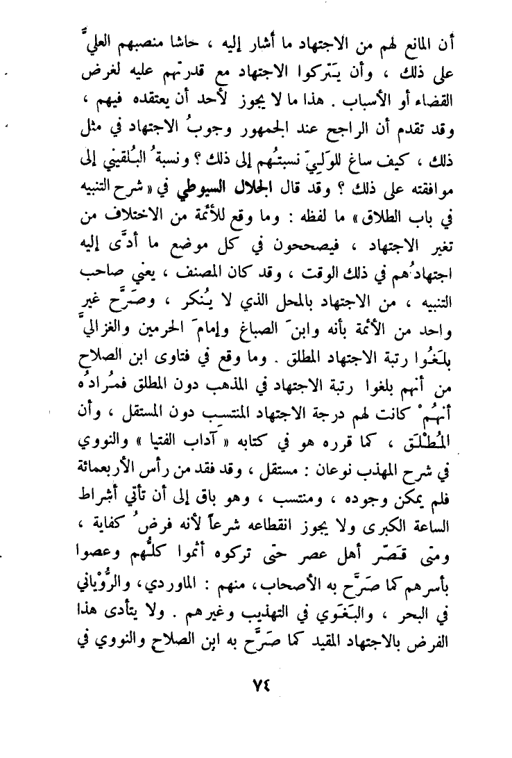 أَن الْمَانِع لَهُم من الِاجْتِهَاد مَا أَشَارَ إِلَيْهِ حاشا منصبهم الْعلي على ذَلِك وَأَن يتْركُوا الِاجْتِهَاد مَعَ قدرتهم عَلَيْهِ لغَرَض الْقَضَاء أَو الْأَسْبَاب هَذَا مَا لَا يجوز لأحد أَن يَعْتَقِدهُ فيهم وَقد تقدم أَن الرَّاجِح عِنْد الْجُمْهُور وجوب الِاجْتِهَاد فِي مثل ذَلِك كَيفَ سَاغَ للْوَلِيّ نسبتهم إِلَى ذَلِك وَنسبَة البُلْقِينِيّ إِلَى مُوَافَقَته على ذَلِك وَقد قَالَ الْجلَال السُّيُوطِيّ فِي شرح التَّنْبِيه فِي بَاب الطَّلَاق مَا لَفظه وَمَا وَقع للأئمة من الِاخْتِلَاف من تغير الِاجْتِهَاد فيصححون فِي كل مَوضِع مَا أدّى إِلَيْهِ اجتهادهم فِي ذَلِك الْوَقْت وَقد كَانَ المُصَنّف يَعْنِي صَاحب التَّنْبِيه من الِاجْتِهَاد بِالْمحل الَّذِي لَا يُنكر وَصرح غير وَاحِد من الْأَئِمَّة بِأَنَّهُ وَابْن الصّباغ وَإِمَام الْحَرَمَيْنِ وَالْغَزالِيّ بلغُوا رُتْبَة الِاجْتِهَاد الْمُطلق وَمَا وَقع فِي فَتَاوَى ابْن الصّلاح من أَنهم بلغُوا رُتْبَة الِاجْتِهَاد فِي الْمَذْهَب دون الْمُطلق فمراده أَنهم كَانَت لَهُم دَرَجَة الِاجْتِهَاد المنتسب دون المستقل وَأَن الْمُطلق كَمَا قَرَّرَهُ هُوَ فِي كِتَابه آدَاب الْفتيا وَالنَّوَوِيّ فِي شرح الْمُهَذّب نَوْعَانِ مُسْتَقل وَقد فقد من رَأس الأربعمائة فَلم يُمكن وجوده ومنتسب وَهُوَ بَاقٍ إِلَى أَن تَأتي أَشْرَاط السَّاعَة الْكُبْرَى وَلَا يجوز انْقِطَاعه شرعا لِأَنَّهُ فرض كِفَايَة وَمَتى قصر أهل عصر حَتَّى تَرَكُوهُ أثموا كلهم وعصوا بأسرهم كَمَا صرح بِهِ الْأَصْحَاب مِنْهُم الْمَاوَرْدِيّ وَالرُّويَانِيّ فِي الْبَحْر وَالْبَغوِيّ فِي التَّهْذِيب وَغَيرهم وَلَا يُنَادى هَذَا الْفَرْض بِالِاجْتِهَادِ الْمُقَيد كَمَا صرح بِهِ ابْن اصلاح وَالنَّوَوِيّ فِي
