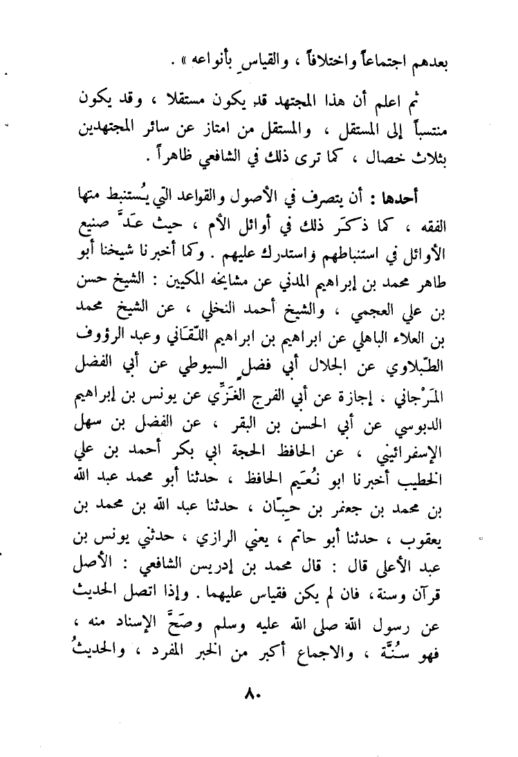 أَحدهَا أَن يتَصَرَّف فِي الْأُصُول وَالْقَوَاعِد الَّتِي يستنبط مِنْهَا الْفِقْه كَمَا ذكر ذَلِك فِي أَوَائِل الْأُم حَيْثُ عد صَنِيع الْأَوَائِل فِي استنباطهم واستدرك عَلَيْهِم وكما أخبرنَا شَيخنَا أَبُو طَاهِر مُحَمَّد بن إِبْرَاهِيم الْمدنِي عَن مشايخه المكيين الشَّيْخ حسن بن عَليّ العجمي وَالشَّيْخ أَحْمد النخلي عَن الشَّيْخ مُحَمَّد بن الْعَلَاء الْبَاهِلِيّ عَن إِبْرَاهِيم بن إِبْرَاهِيم اللَّقَّانِيّ وَعبد الرؤوف الطبلاوي عَن الْجلَال أبي فضل السُّيُوطِيّ عَن أبي الْفضل الْمرْجَانِي إجَازَة عَن أبي الْفرج الْغَزِّي عَن يُونُس بن إِبْرَاهِيم الدبوسي عَن أبي الْحسن بن الْبَقر عَن الْفضل بن سهل الإسفرائيني عَن الْحَافِظ الْحجَّة أبي بكر أَحْمد بن عَليّ الْخَطِيب أخبرنَا أَبُو نعيم الْحَافِظ حَدثنَا أَبُو مُحَمَّد عبد الله بن مُحَمَّد بن جَعْفَر بن حبَان حَدثنَا عبد الله بن مُحَمَّد بن يَعْقُوب حَدثنَا أَبُو حَاتِم يَعْنِي الرَّازِيّ حَدثنِي يُونُس بن عبد الْأَعْلَى قَالَ قَالَ مُحَمَّد بن إِدْرِيس الشَّافِعِي الأَصْل قُرْآن وَسنة فان لم يكن فَقِيَاس عَلَيْهِمَا وَإِذا اتَّصل الحَدِيث عَن رَسُول الله صلى الله عَلَيْهِ وَسلم وَصَحَّ الْإِسْنَاد مِنْهُ فَهُوَ سنة والاجماع أكبر من الْخَبَر الْمُفْرد والْحَدِيث