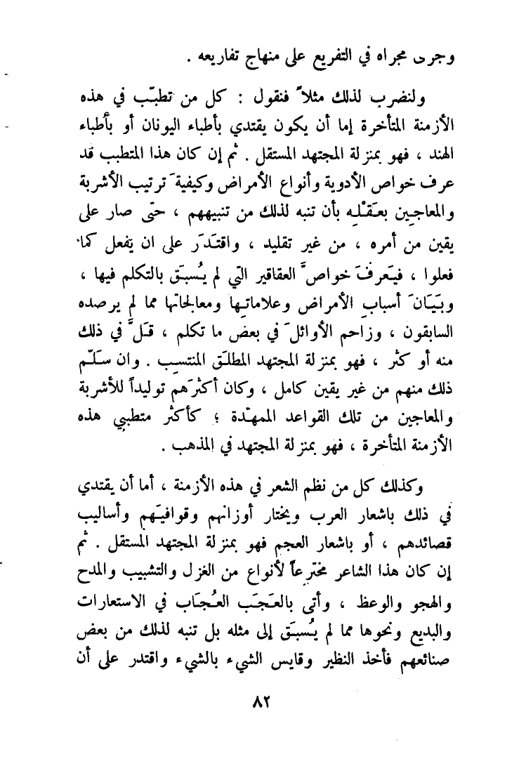 ولنضرب لذَلِك مثلا فَنَقُول كل من تطيب فِي هَذِه الْأَزْمِنَة الْمُتَأَخِّرَة إِمَّا أَن يكون يَقْتَدِي بأطباء اليونان أَو بأطباء الْهِنْد فَهُوَ بِمَنْزِلَة الْمُجْتَهد المستقل ثمَّ إِن كَانَ هَذَا المتطبب قد عرف خَواص الْأَدْوِيَة وأنواع الْأَمْرَاض وَكَيْفِيَّة تَرْتِيب الْأَشْرِبَة والمعاجين بعقله بِأَن تنبه لذَلِك من تنبيههم حَتَّى صَار على يَقِين من أمره من غير تَقْلِيد واقتدر على أَن يفعل كَمَا فعلوا فَيعرف خَواص العقاقير الَّتِي لم يسْبق بالتكلم فِيهَا وَبَيَان أَسبَاب الْأَمْرَاض وعلاماتها ومعالجاتها مِمَّا لم يرصده السَّابِقُونَ وزاحم الْأَوَائِل فِي بعض مَا تكلم قل فِي ذَلِك مِنْهُ أَو كثر فَهُوَ بِمَنْزِلَة الْمُجْتَهد الْمُطلق المنتسب وان سلم ذَلِك مِنْهُم من غير يَقِين كَامِل وَكَانَ أَكْثَرهم توليدا للأشربة والمعاجين من تِلْكَ الْقَوَاعِد الممهدة كأكثر متطببي هَذِه الْأَزْمِنَة الْمُتَأَخِّرَة فَهُوَ بِمَنْزِلَة الْمُجْتَهد فِي الْمَذْهَب