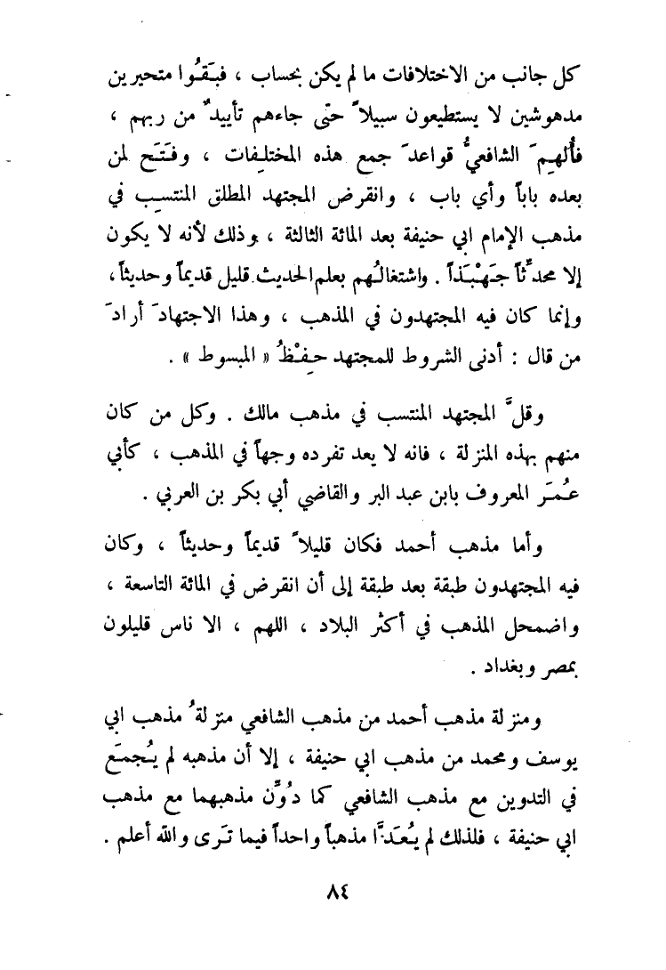 كل جَانب من الاختلافات مَا لم يكن بِحِسَاب فبقوا متحيرين مدهوشين لَا يَسْتَطِيعُونَ سَبِيلا حَتَّى جَاءَهُم تأييد من رَبهم فألهم الشَّافِعِي قَوَاعِد جمع هَذِه المختلفات وَفتح لمن بعده بَابا وَأي بَاب وانقرض الْمُجْتَهد الْمُطلق المنتسب فِي مَذْهَب الإِمَام أبي حنيفَة بعد الْمِائَة الثَّالِثَة وَذَلِكَ لِأَنَّهُ لَا يكون إِلَّا مُحدثا جهبذا واشتغالهم بِعلم الحَدِيث قَلِيل قَدِيما وحديثا وَإِنَّمَا كَانَ فِيهِ المجتهدون فِي الْمَذْهَب وَهَذَا الِاجْتِهَاد أَرَادَ من قَالَ أدنى الشُّرُوط للمجتهد حفظ الْمَبْسُوط