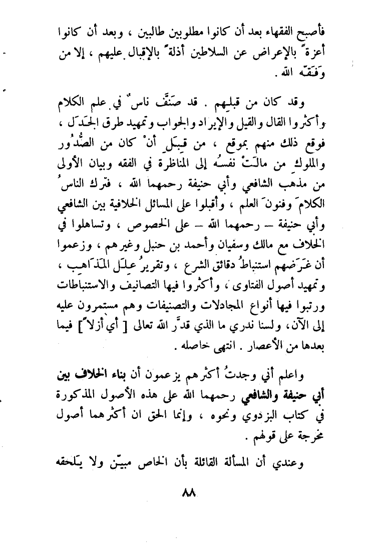 وَقد كَانَ من قبلهم قد صنف نَاس فِي علم الْكَلَام وَأَكْثرُوا القال والقيل والإيراد وَالْجَوَاب وتمهيد طرق الجدل فَوَقع ذَلِك مِنْهُم بموقع من قبل أَن كَانَ من الصُّدُور والملوك من مَالَتْ نَفسه إِلَى المناظرة فِي الْفِقْه وَبَيَان الأولى من مَذْهَب الشَّافِعِي وَأبي حنيفَة رحمهمَا الله فَترك النَّاس الْكَلَام وفنون الْعلم وَأَقْبلُوا على الْمسَائِل الخلافية بَين الشَّافِعِي وَأبي حنيفَة رحمهمَا الله على الْخُصُوص وتساهلوا فِي الْخلاف مَعَ مَالك وسُفْيَان وَأحمد بن حَنْبَل وَغَيرهم وَزَعَمُوا أَن غرضهم استنباط دقائق الشَّرْع وَتَقْرِير علل الْمذَاهب وتمهيد أصُول الفتاوي وَأَكْثرُوا فِيهَا التصانيف والاستنباطات ورتبوا فِيهَا أَنْوَاع المجادلات والتصنيفات وهم مستمرون عَلَيْهِ إِلَى الْآن ولسنا نَدْرِي مَا الَّذِي قدر الله تَعَالَى أَي أزلا فِيمَا بعْدهَا من الْأَعْصَار انْتهى حَاصله