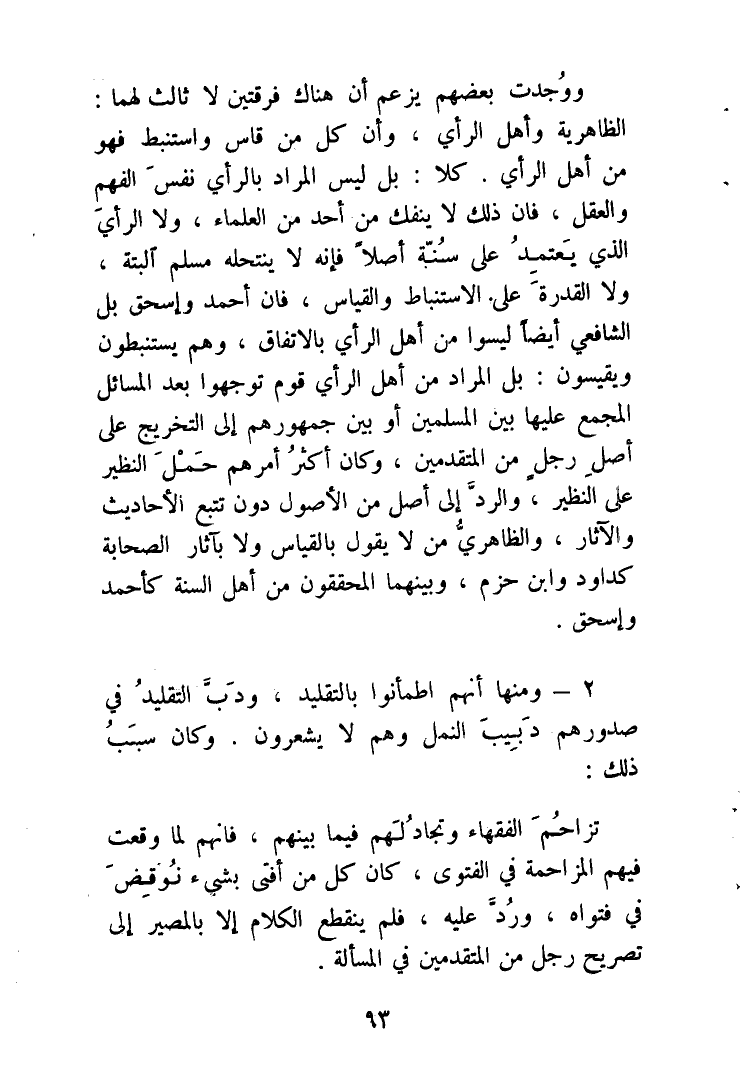 وَوجدت بَعضهم يزْعم أَن هُنَاكَ فرْقَتَيْن لَا ثَالِث لَهما الظَّاهِرِيَّة وَأهل الرَّأْي وَأَن كل من قَاس واستنبط فَهُوَ من أهل الرَّأْي كلا بل لَيْسَ المُرَاد بِالرَّأْيِ نفس الْفَهم وَالْعقل فان ذَلِك لَا يَنْفَكّ من أحد من الْعلمَاء وَلَا الرَّأْي الَّذِي يعْتَمد على سنة أصلا فَإِنَّهُ لَا يَنْتَحِلهُ مُسلم الْبَتَّةَ وَلَا الْقُدْرَة على الاستنباط وَالْقِيَاس فان أَحْمد وَإِسْحَق بل الشَّافِعِي أَيْضا لَيْسُوا من أهل الرَّأْي بالِاتِّفَاقِ وهم يستنبطون ويقيسون بل المُرَاد من أهل الرَّأْي قوم توجهوا بعد الْمسَائِل الْمجمع عَلَيْهَا بَين الْمُسلمين أَو بَين جمهورهم إِلَى التَّخْرِيج على أصل رجل من الْمُتَقَدِّمين وَكَانَ أَكثر أَمرهم حمل النظير على النظير وَالرَّدّ إِلَى أصل من الْأُصُول دون تتبع الْأَحَادِيث والْآثَار والظاهري من لَا يَقُول بِالْقِيَاسِ وَلَا بآثار الصَّحَابَة كداود وَابْن حزم وَبَينهمَا الْمُحَقِّقُونَ من أهل السّنة كأحمد وَإِسْحَق