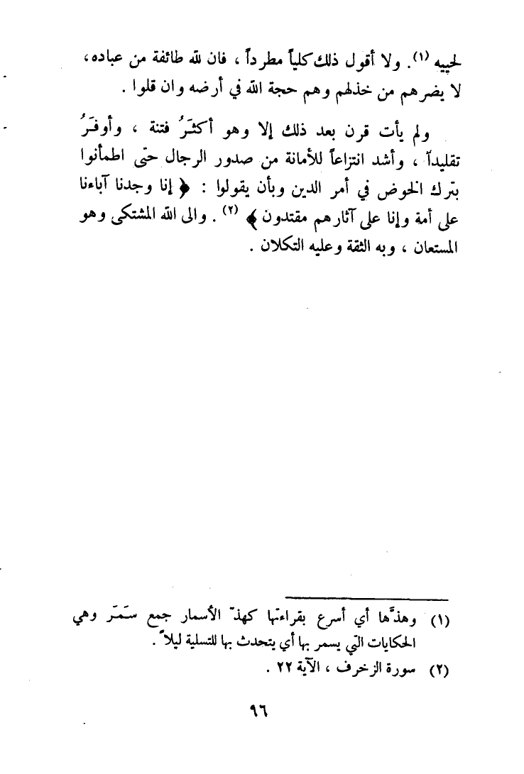 وَلم يَأْتِ قرن بعد ذَلِك إِلَّا وَهُوَ أَكثر فتْنَة وأوفر تقليدا وَأَشد انتزاعا للأمانة من صُدُور الرِّجَال حَتَّى اطمأنوا بترك الْخَوْض فِي أَمر الدّين وَبِأَن يَقُولُوا {إِنَّا وجدنَا آبَاءَنَا على أمة وَإِنَّا على آثَارهم مقتدون} وَإِلَى الله المشتكى وَهُوَ الْمُسْتَعَان وَبِه الثِّقَة وَعَلِيهِ التكلان