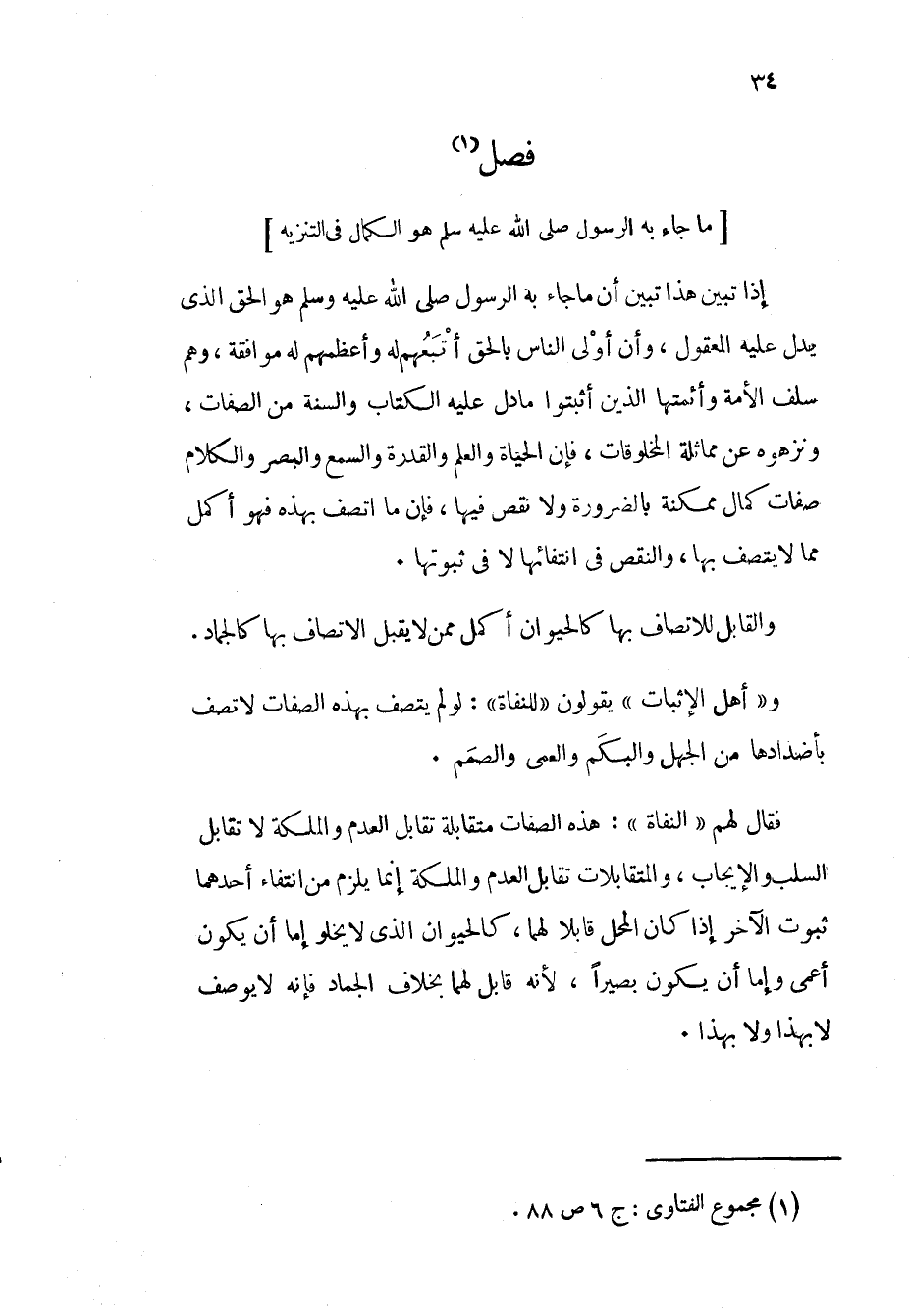 إذا تبين هذا تبين أن ما جاء به الرسول صلى الله عليه وسلم هو الحق الذي يدل عليه المعقول، وأن أولى الناس بالحق أتبعهم له وأعظمهم له موافقة، وهم سلف الأمة وأئمتها الذين أثبتوا ما دل عليه الكتاب والسنة من الصفات، ونزهوه عن مماثلة المخلوقات، فإن الحياة والعلم والقدرة والسمع والبصر والكلام صفات كمال ممكنة بالضرورة ولا نقص فيها، فإن ما اتصف بهذه فهو أكمل مما لا يتصف بها، والنقص في انتفائها لا في ثبوتها.