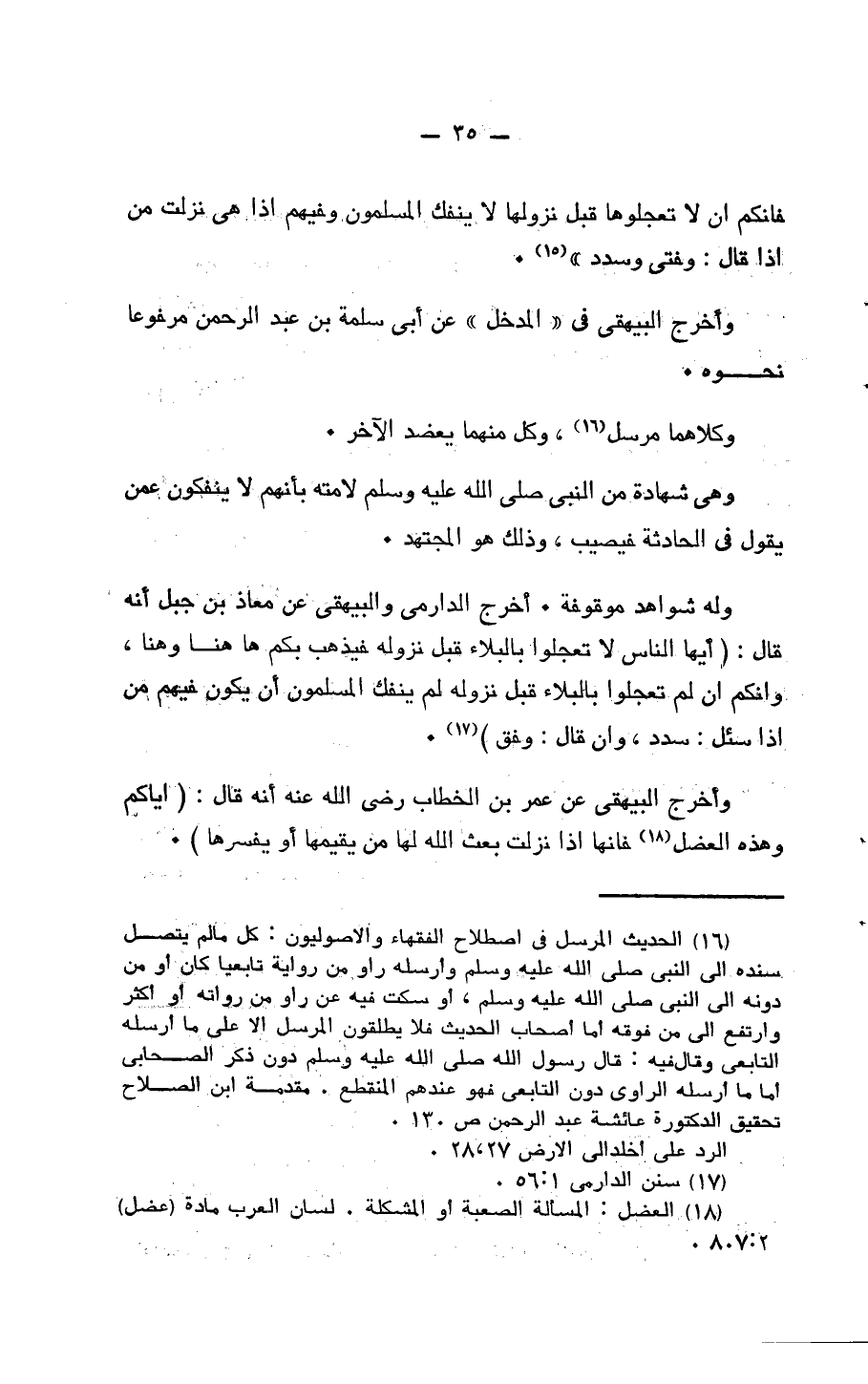 وَله شَوَاهِد مَوْقُوفَة وَأخرج الدَّارمِيّ وَالْبَيْهَقِيّ عَن معَاذ بن جبل أَنه قَالَ أَيهَا النَّاس لَا تعجلوا بالبلاء قبل نُزُوله فَيذْهب بكم هَا هُنَا وأنكم إِن لم تعجلوا بالبلاء قبل نُزُوله لم يَنْفَكّ الْمُسلمُونَ أَن يكون فيهم من إِذا سُئِلَ سدد وَإِن قَالَ وفْق