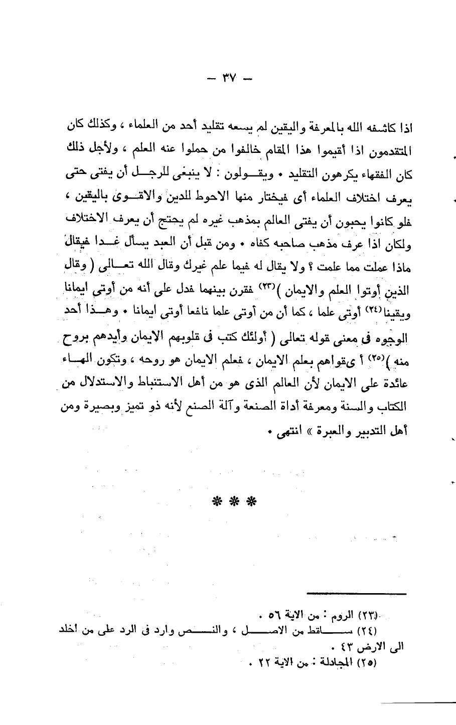 إِذا كاشفه الله بالمعرفة وَالْيَقِين لم يَسعهُ تَقْلِيد أحد من الْعلمَاء وَكَذَلِكَ كَانَ المتقدمون إِذا أقِيمُوا هَذَا الْمقَام خالفوا من حملُوا عَنهُ الْعلم وَلأَجل ذَلِك كَانَ الْفُقَهَاء يكْرهُونَ التَّقْلِيد وَيَقُولُونَ لَا يَنْبَغِي للرجل أَن يُفْتى حَتَّى يعرف اخْتِلَاف الْعلمَاء أَي فيختار مِنْهَا الْأَحْوَط للدّين والأقوى بِالْيَقِينِ فَلَو كَانُوا يحبونَ أَن يُفْتى الْعَالم بِمذهب غَيره لم يحْتَج أَن يعرف الِاخْتِلَاف ولكان إِذا عرف مَذْهَب صَاحبه كَفاهُ وَمن قبل أَن العَبْد يسْأَل غَدا فَيُقَال مَاذَا عملت مِمَّا علمت وَلَا يُقَال لَهُ فِيمَا علم غَيْرك وَقَالَ الله تَعَالَى {وَقَالَ الَّذين أُوتُوا الْعلم وَالْإِيمَان} فقرن بَينهمَا فَدلَّ على أَنه من أُوتِيَ إِيمَانًا ويقينا أُوتِيَ علما كَمَا أَن من أُوتِيَ علما نَافِعًا أُوتِيَ إِيمَانًا وَهَذَا أحد الْوُجُوه فِي معنى قَوْله تَعَالَى {أُولَئِكَ كتب فِي قُلُوبهم الْإِيمَان وأيدهم بِروح مِنْهُ} أَي قواهم بِعلم الْإِيمَان فَعلم الْإِيمَان هُوَ روحه وَتَكون الْهَاء عَائِدَة على الْإِيمَان لِأَن الْعَالم الَّذِي هُوَ من أهل الاستنباط وَالِاسْتِدْلَال من الْكتاب وَالسّنة وَمَعْرِفَة أَدَاة الصَّنْعَة وَآلَة الصنع لِأَنَّهُ ذُو تميز وبصيرة وَمن أهل التَّدْبِير وَالْعبْرَة انْتهى