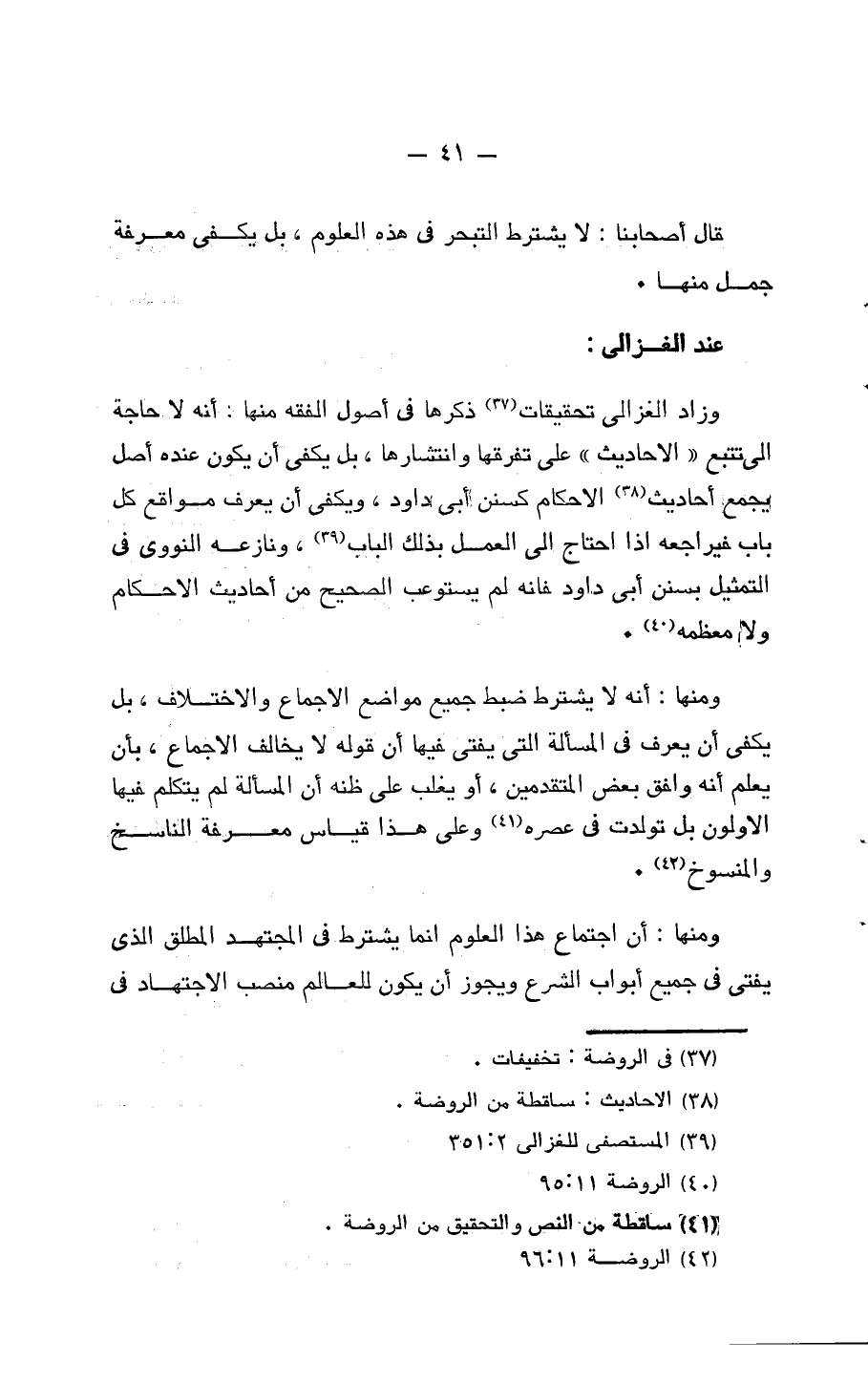 وَزَاد الْغَزالِيّ تحقيقات ذكرهَا فِي أصُول الْفِقْه مِنْهَا أنة لَا حَاجَة إِلَى تتبع الْأَحَادِيث على تفرقها وانتشارها بل يَكْفِي أَن يكون عِنْده أصل يجمع أَحَادِيث الْأَحْكَام كسنن أبي دَاوُد وَيَكْفِي أَن يعرف مواقع كل بَاب فيراجعه إِذا احْتَاجَ إِلَى الْعَمَل بذلك الْبَاب ونازعه النَّوَوِيّ فِي التَّمْثِيل بسنن أبي دَاوُد فَإِنَّهُ لم يستوعب الصَّحِيح من أَحَادِيث الْأَحْكَام وَلَا معظمه