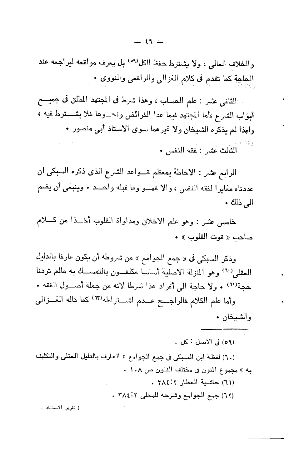 وَذكر السُّبْكِيّ فِي جمع الْجَوَامِع من شُرُوطه أَن يكون عَارِفًا بِالدَّلِيلِ الْعقلِيّ وَهُوَ الْمنزلَة أساسا مكلفون بالتمسك بِهِ مَا لم تردنَا حجَّة وَلَا حَاجَة إِلَى أَفْرَاد هَذَا شرطا لِأَنَّهُ من جملَة أصُول الْفِقْه