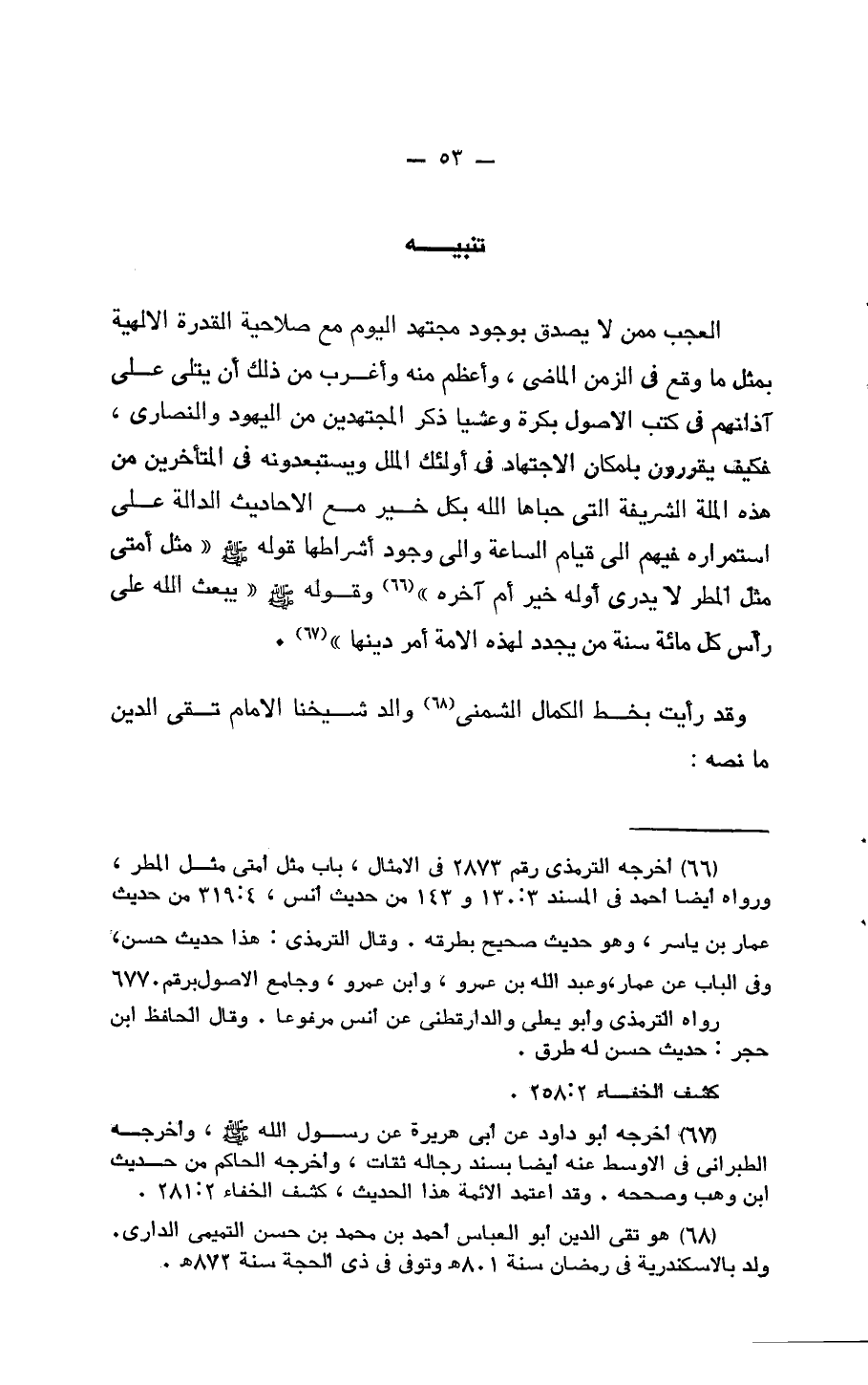 الْعجب مِمَّن لَا يصدق بِوُجُود مُجْتَهد الْيَوْم مَعَ صَلَاحِية الْقُدْرَة الإلهية بِمثل مَا وَقع فِي الزَّمن الْمَاضِي وَأعظم مِنْهُ وَأغْرب من ذَلِك أَن يُتْلَى على آذانهم فِي كتب الْأُصُول بكرَة وعشيا ذكر الْمُجْتَهدين من الْيَهُود وَالنَّصَارَى فَكيف يقررون بِإِمْكَان الِاجْتِهَاد فِي أُولَئِكَ الْملَل ويستبعدونه فِي الْمُتَأَخِّرين من هَذِه الْملَّة الشَّرِيفَة الَّتِي حباها الله بِكُل خير مَعَ الْأَحَادِيث الدَّالَّة على اسْتِمْرَار فيهم إِلَى قيام السَّاعَة وَإِلَى قيام السَّاعَة وَإِلَى وجود أشراطها قَوْله صلى الله عَلَيْهِ وَسلم مثل أمتِي مثل الْمَطَر لَا يدْرِي أَوله خير أم آخِره وَقَوله صلى الله عَلَيْهِ وَسلم يبْعَث الله على رَأس كل مائَة سنة من يجدد لهَذِهِ الْأمة أَمر دينهَا